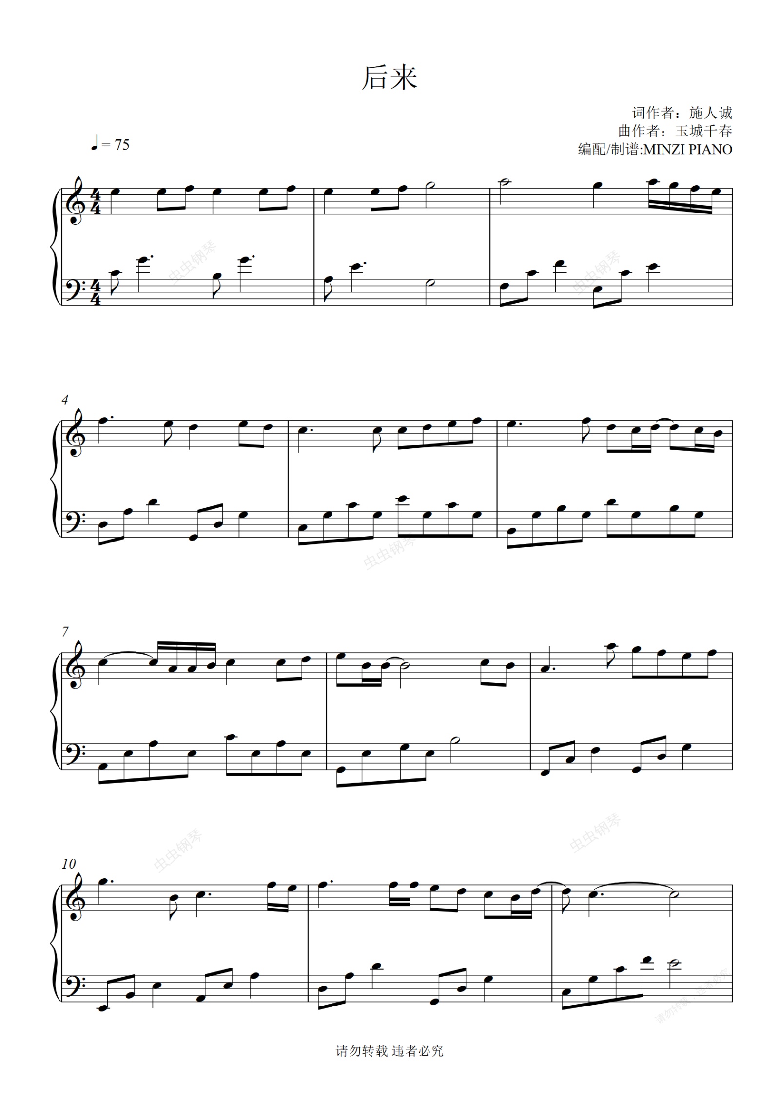 钢琴谱:《后来》刘若英