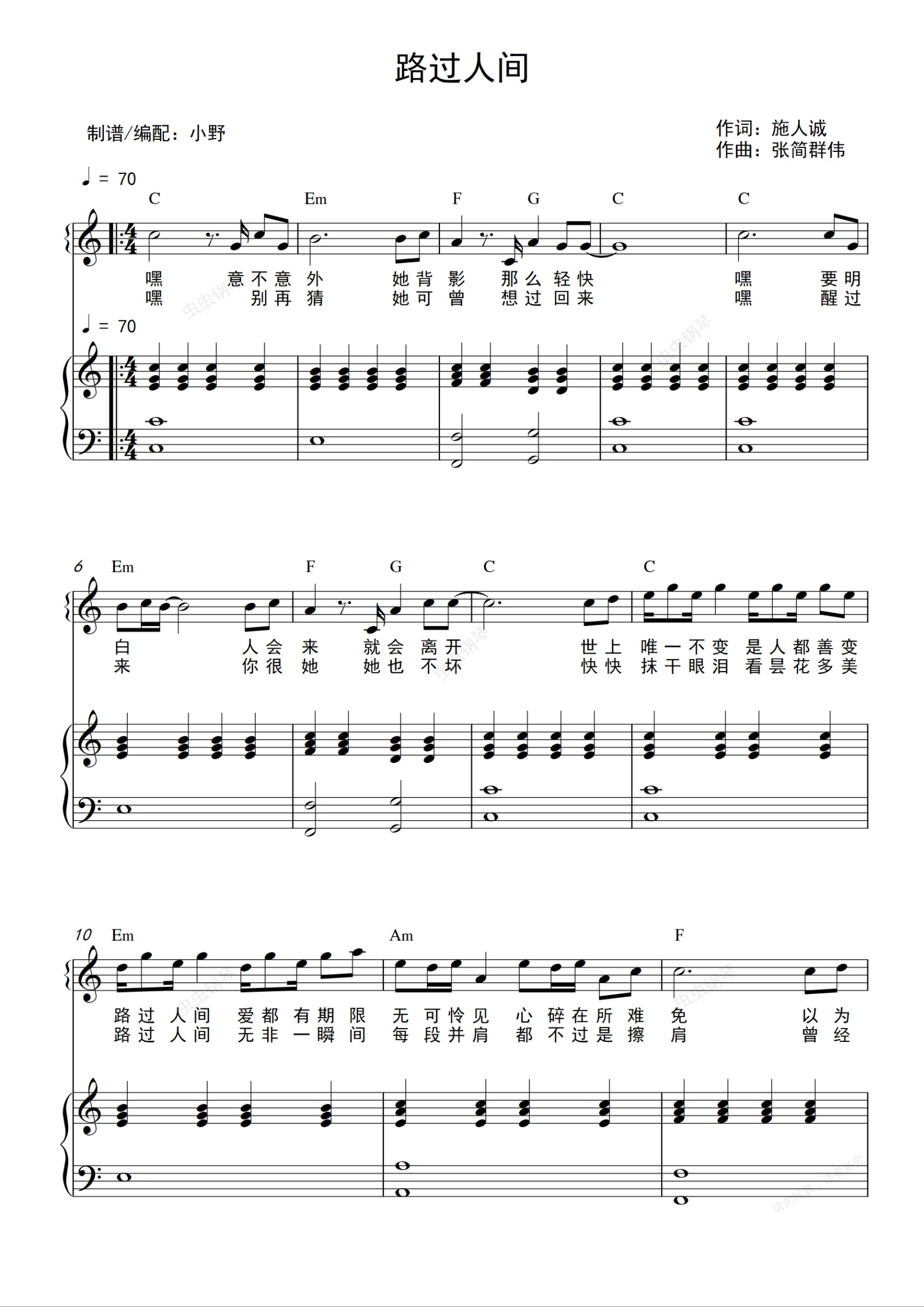 钢琴谱:路过人间(和弦弹唱版)