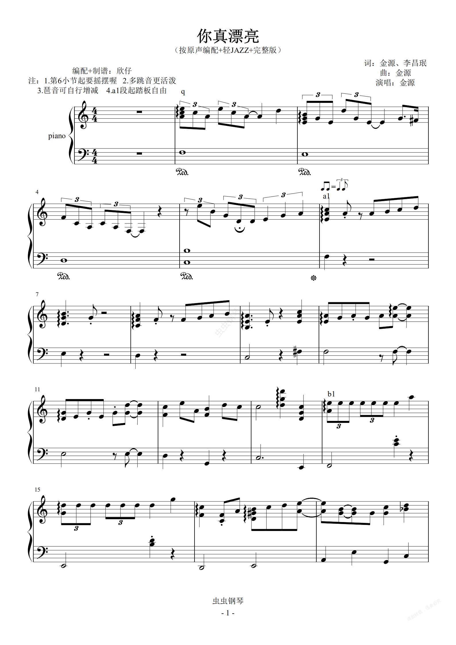 钢琴谱:C-你真漂亮/이쁘다니까《孤单又灿烂的神-鬼怪》OST(轻JAZZ+完整版)