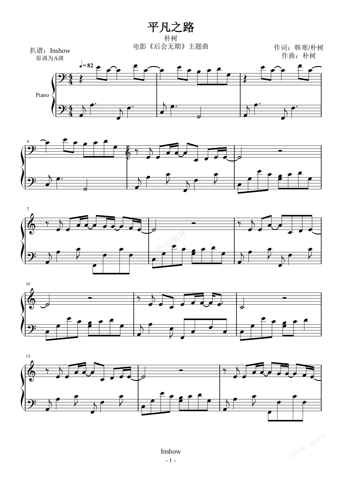 钢琴谱:平凡之路【C调完整独奏】- 朴树 -(电影《后会无期》主题曲)