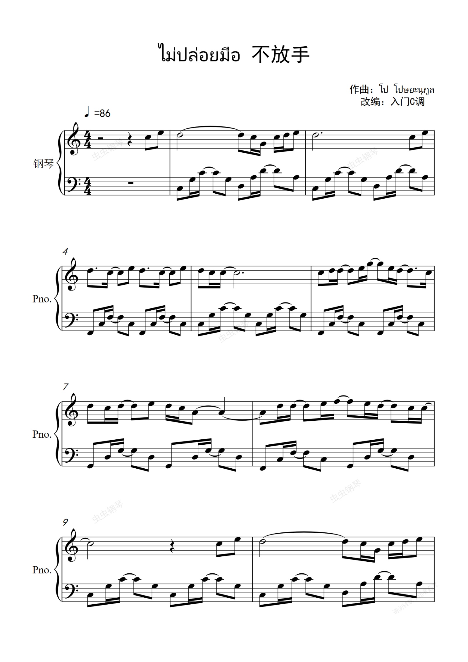 钢琴谱:比尔金、PP《ไม่ปล่อยมือ (不放手)》入门C调简单版