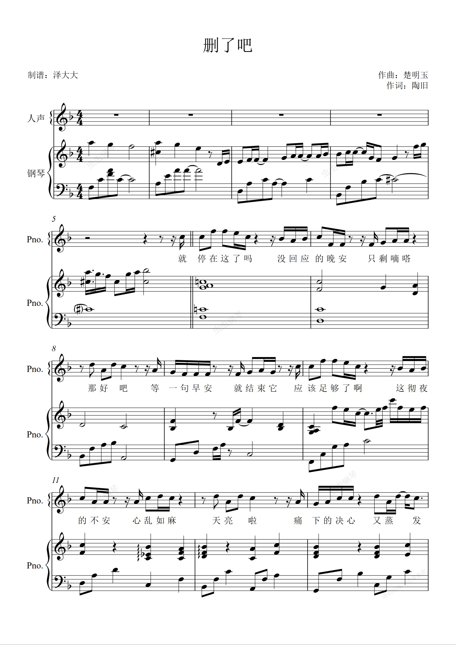 钢琴谱:删了吧【完美弹唱附词】泽大大 丁芙妮