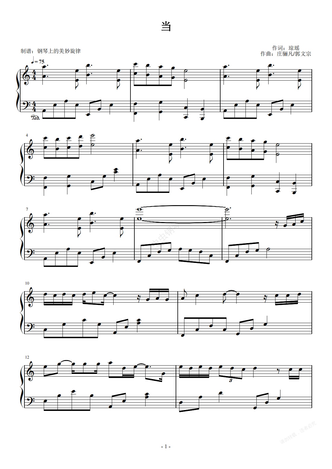 钢琴谱:当 C调简易版 还珠格格主题曲 动力火车