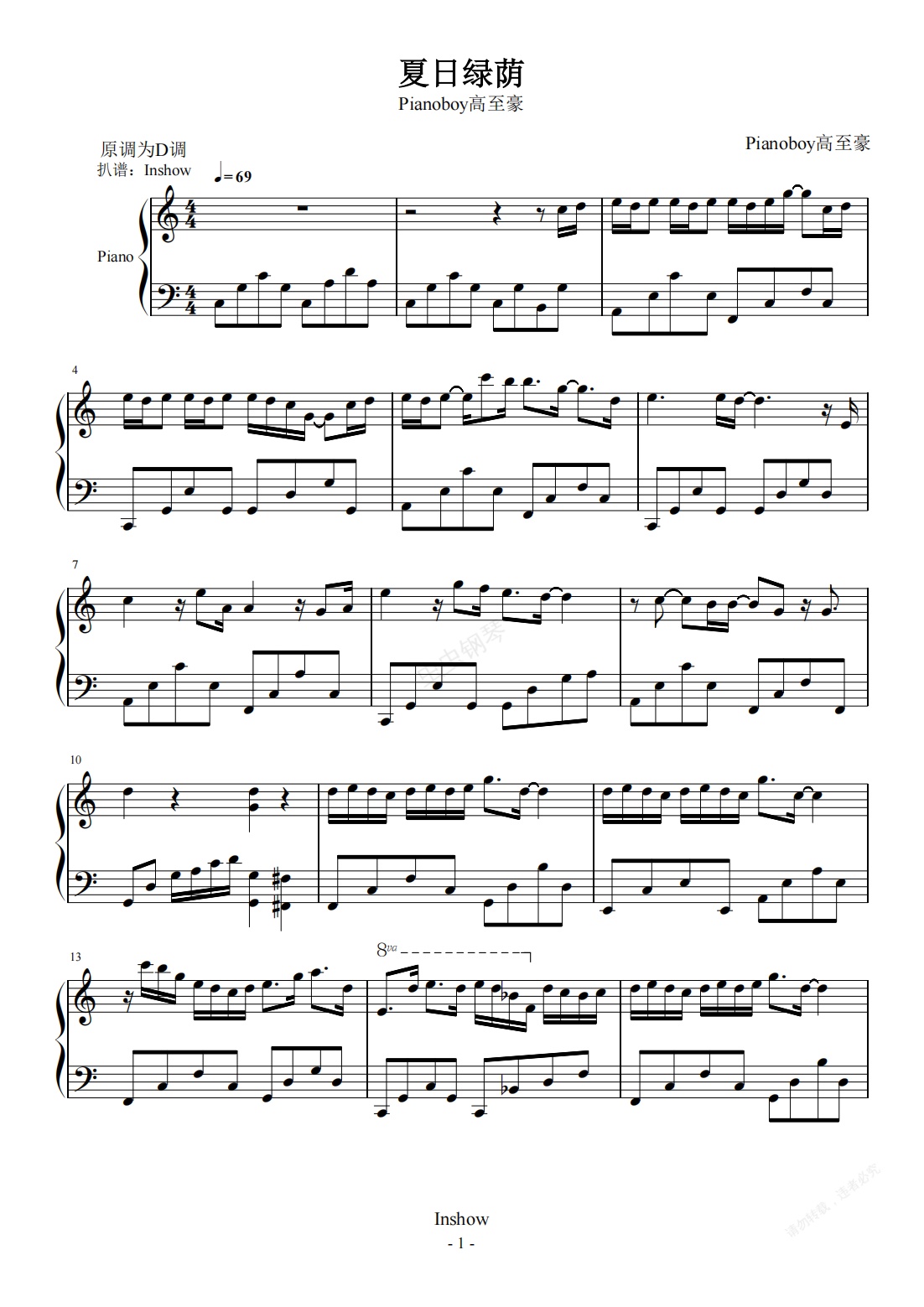 钢琴谱:夏日绿荫【C调独奏】- Pianoboy高至豪 -