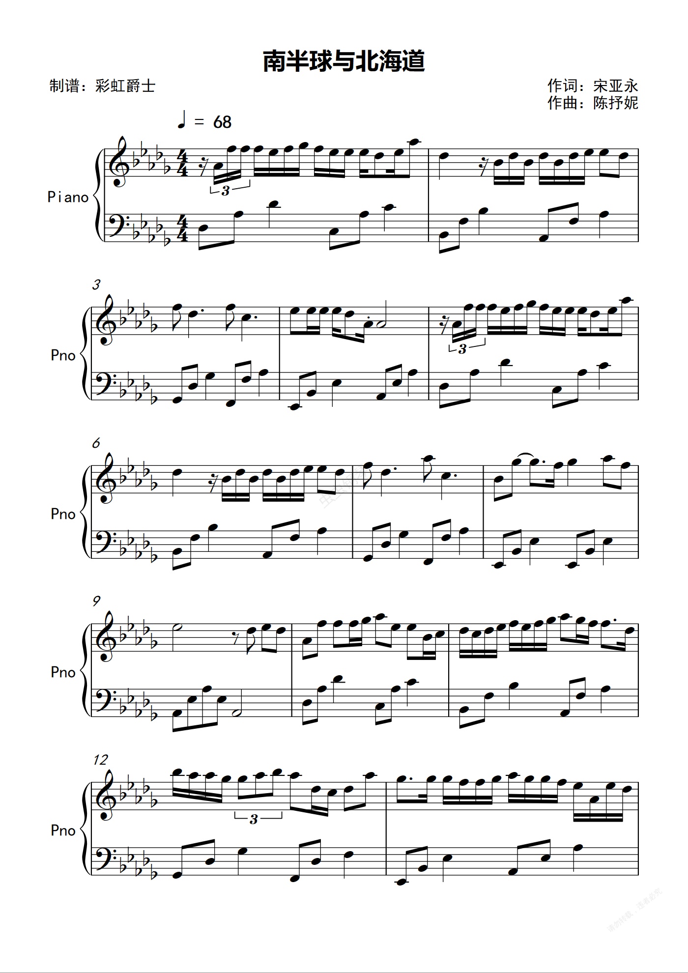 钢琴谱:南半球与北海道 简单版 抖音 范倪Liu