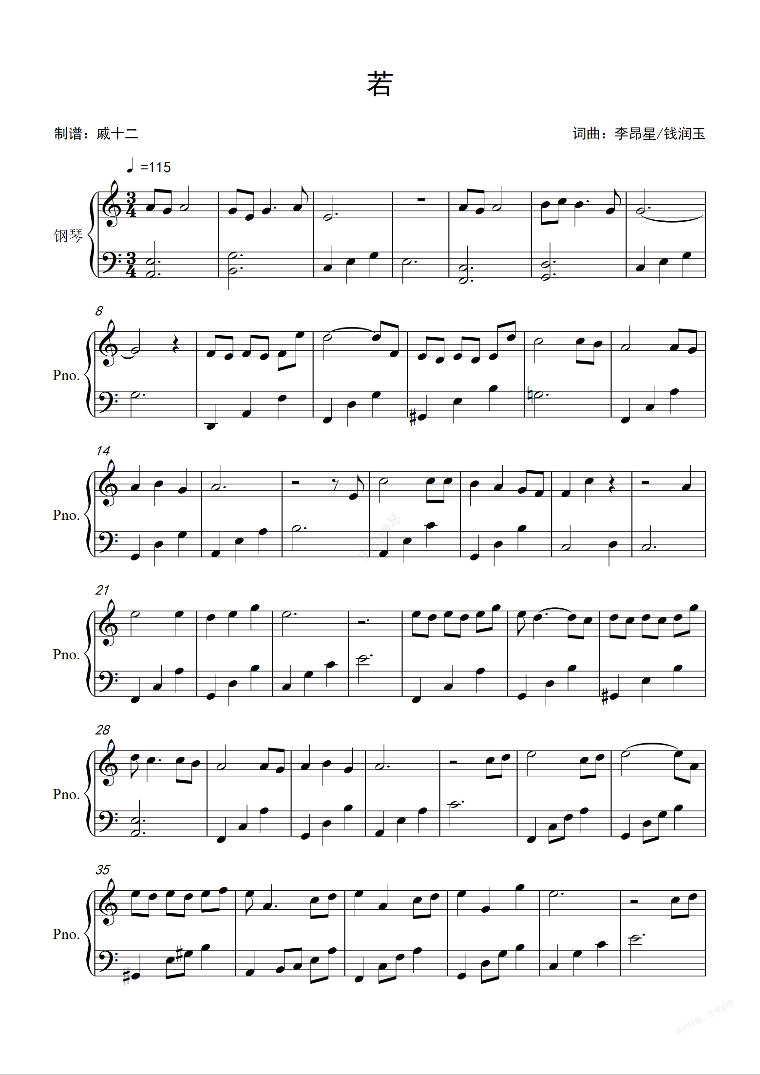 钢琴谱:若-C调简单版