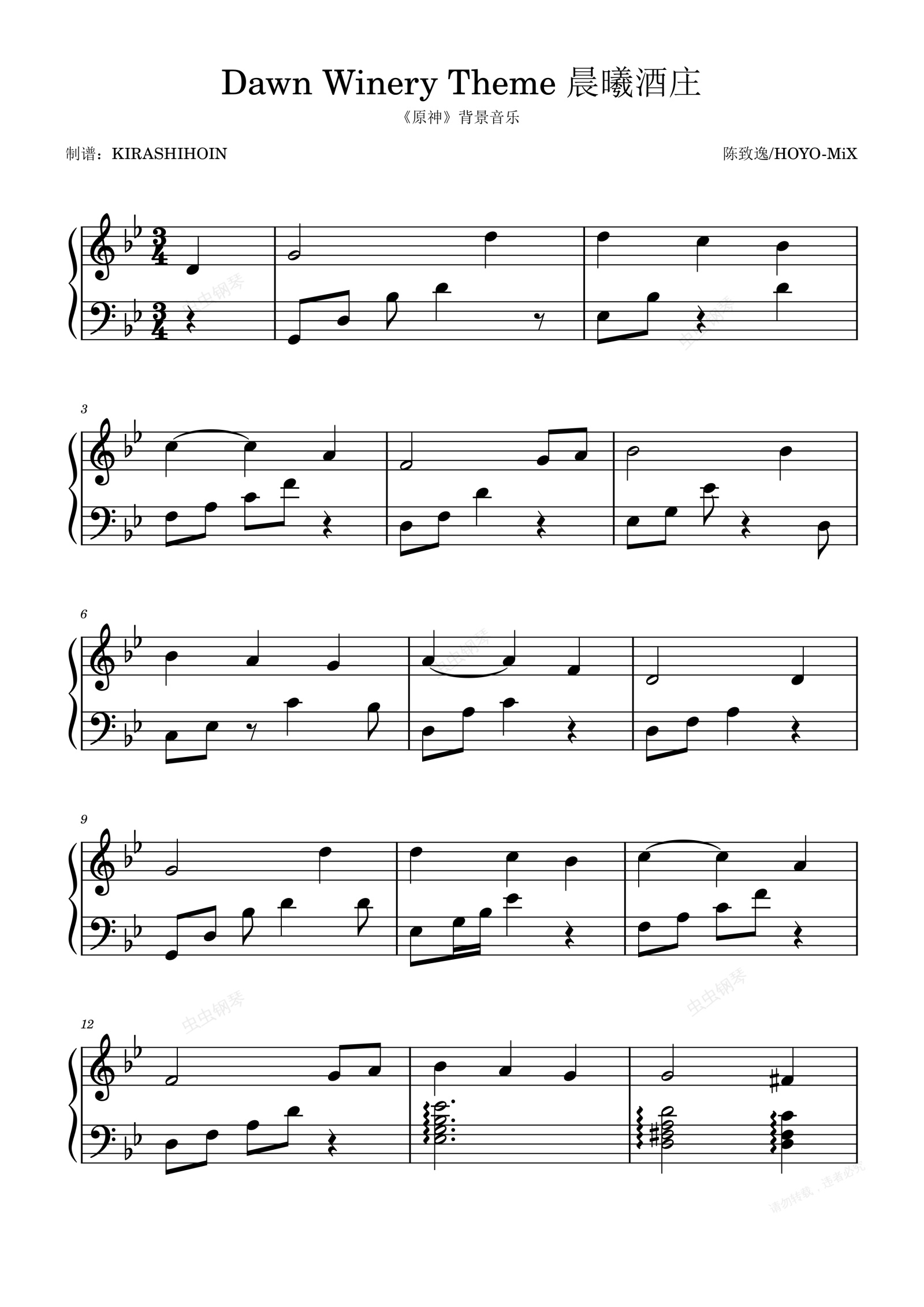 钢琴谱:Dawn Winery Theme 晨曦酒庄(《原神》背景音乐)- 陈致逸
