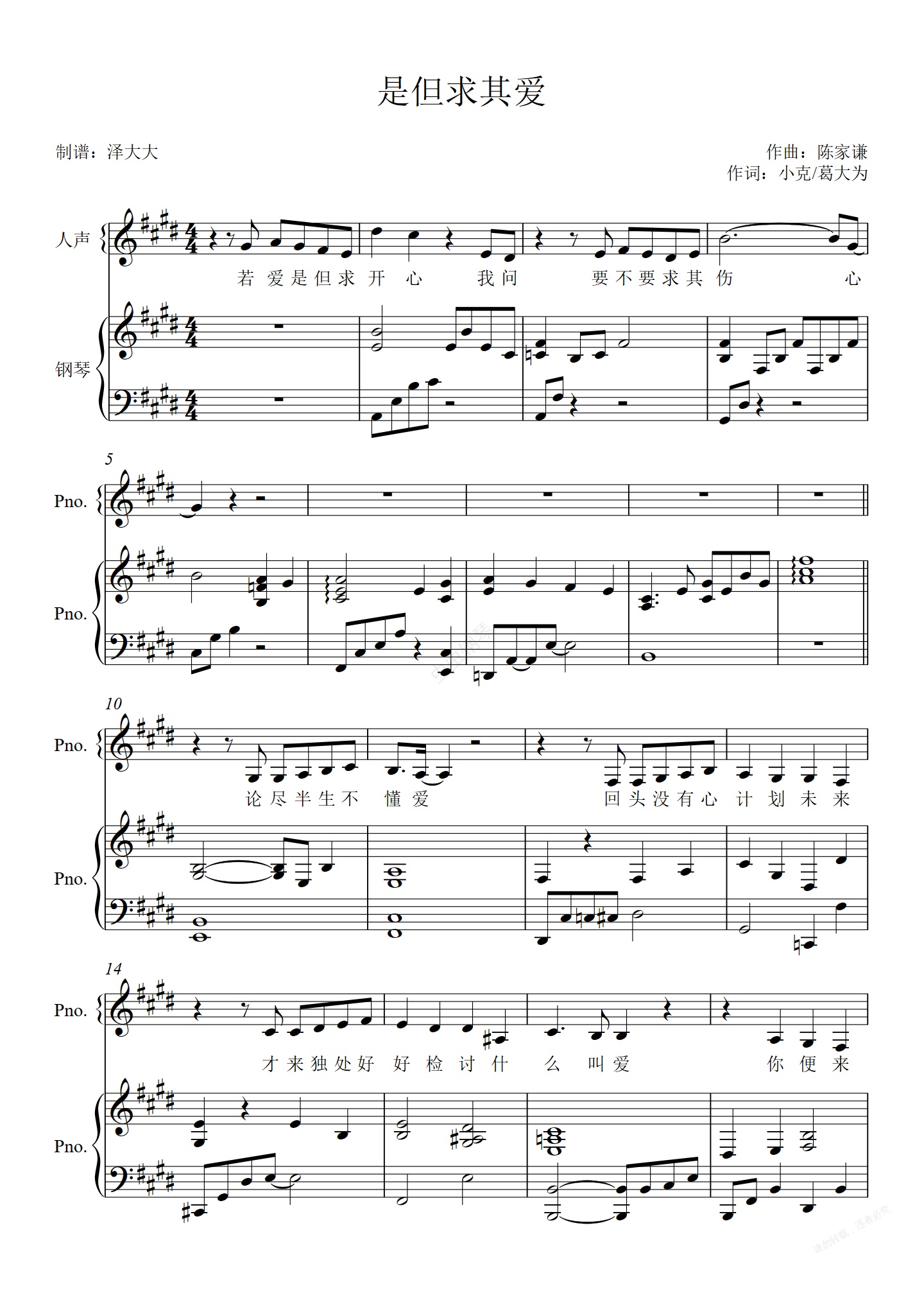 钢琴谱:是但求其爱【女生版弹唱附词】泽大大 陈奕迅