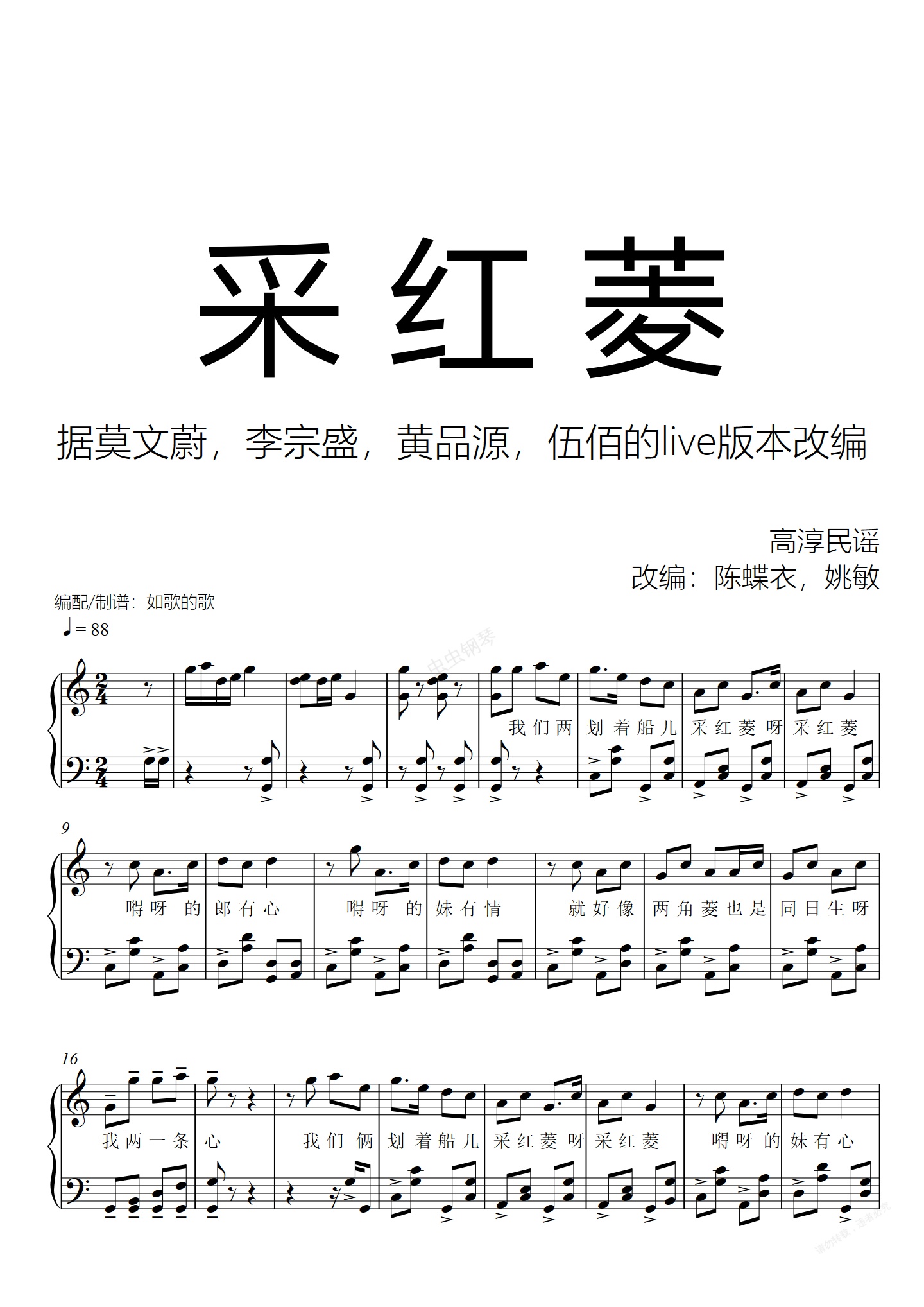 钢琴谱:采红菱-莫文蔚伍佰黄品源李宗盛版本-独奏弹唱