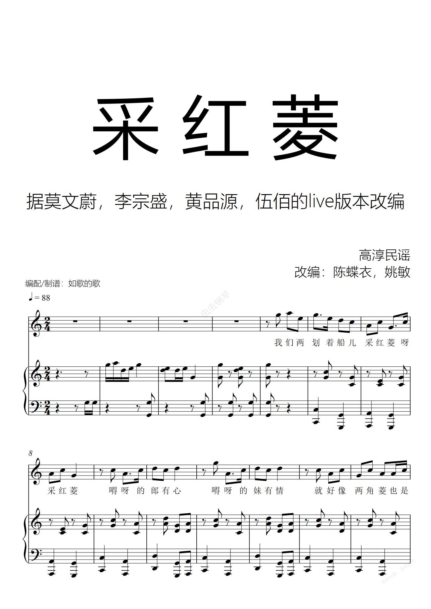钢琴谱:采红菱-莫文蔚伍佰黄品源李宗盛版本-人声+钢伴