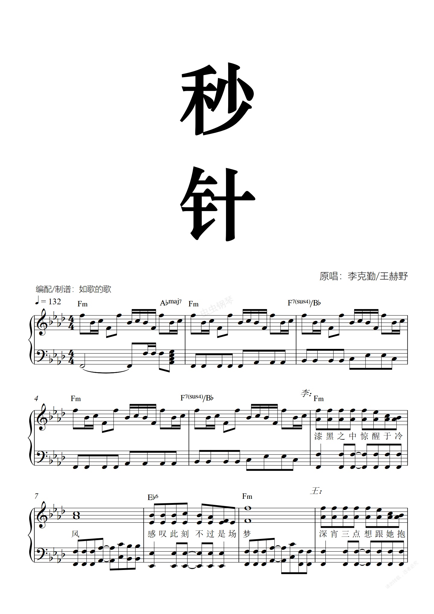 钢琴谱:秒针-李克勤王赫野-歌词功能-中国好声音