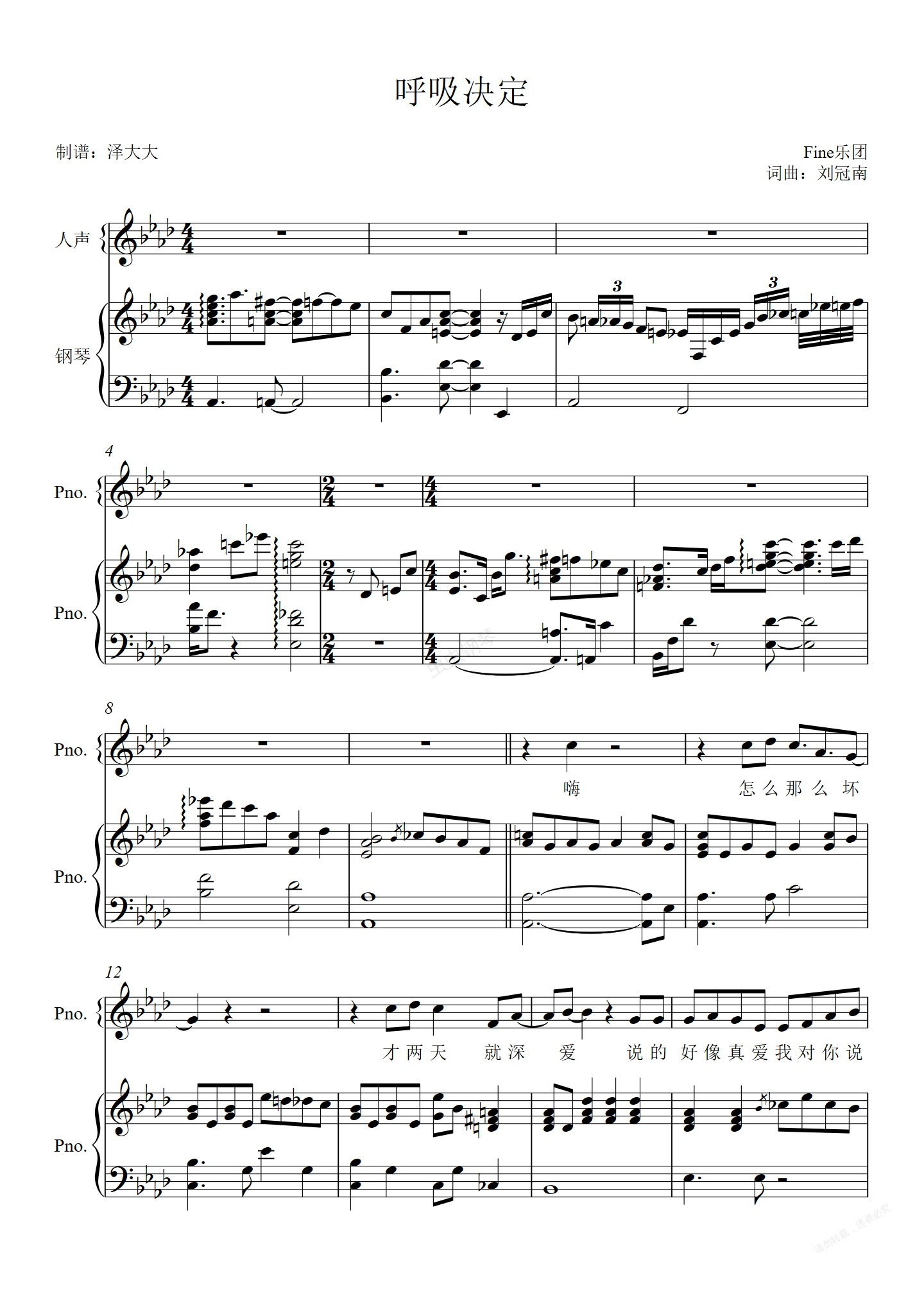 钢琴谱:呼吸决定【原版弹唱附词】泽大大 Fine乐团