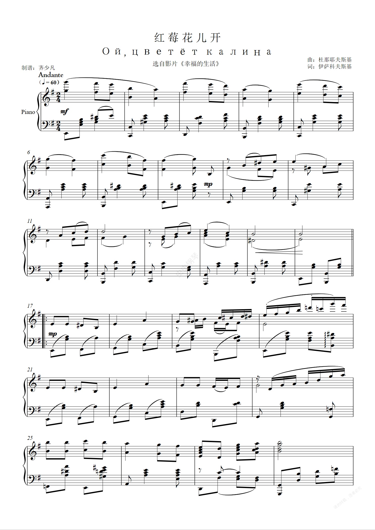 钢琴谱:红梅花儿开 Ой, цветёт калина