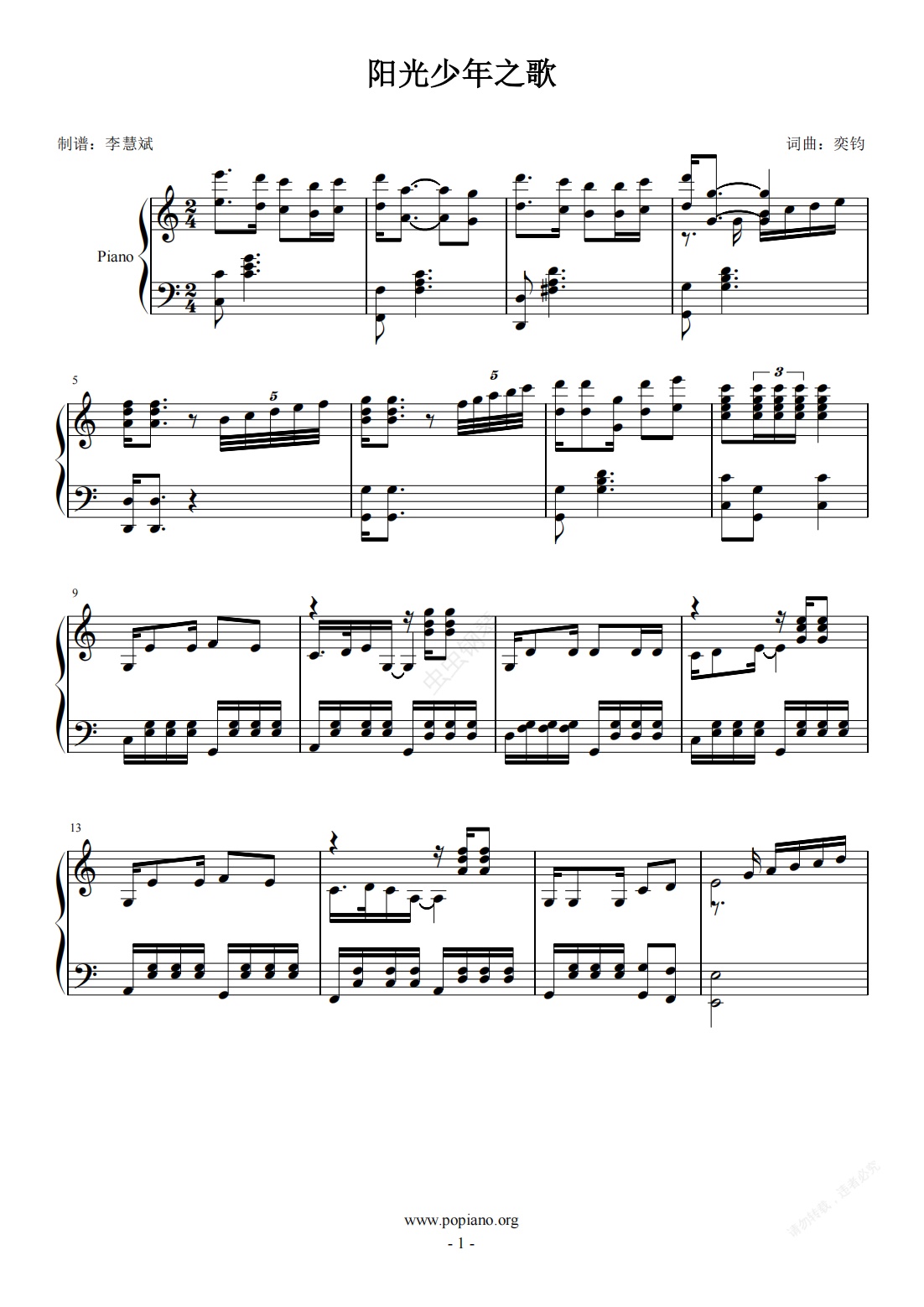 阳光少年之歌钢琴伴奏谱,适合弹唱,合唱伴奏