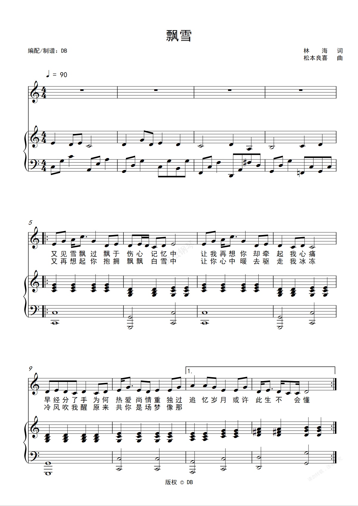 钢琴谱:飘雪(C调弹唱)