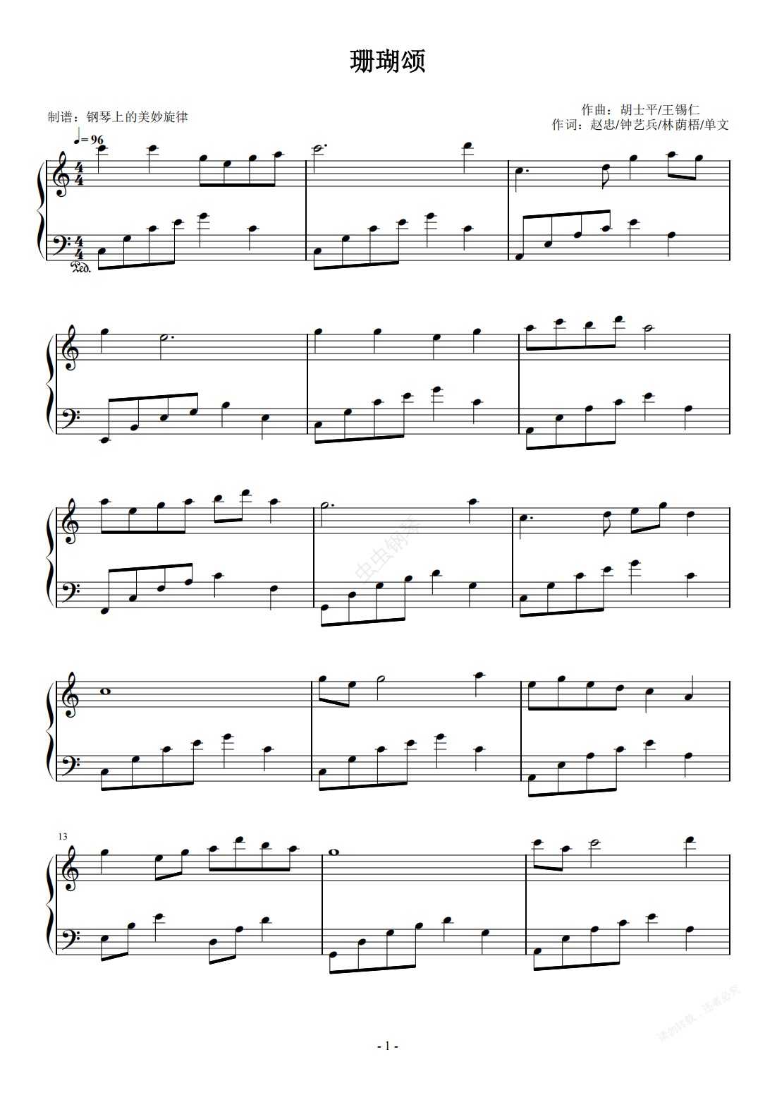 钢琴谱:珊瑚颂 C调简易版 经典红歌