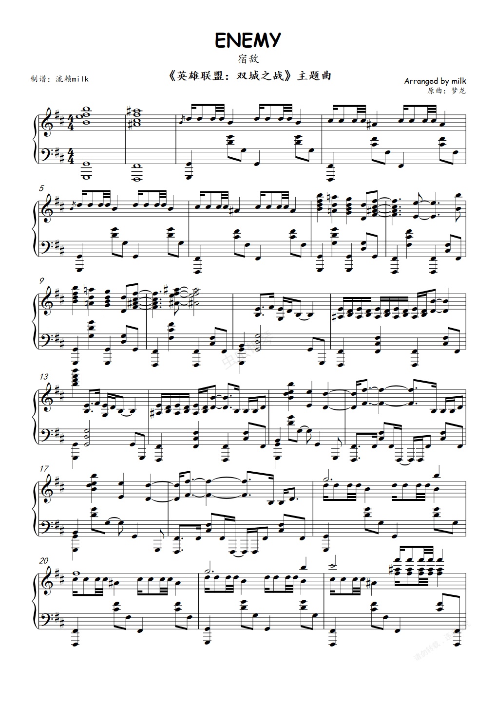 钢琴谱:ENEMY宿敌,《英雄联盟:双城之战》主题曲,钢琴