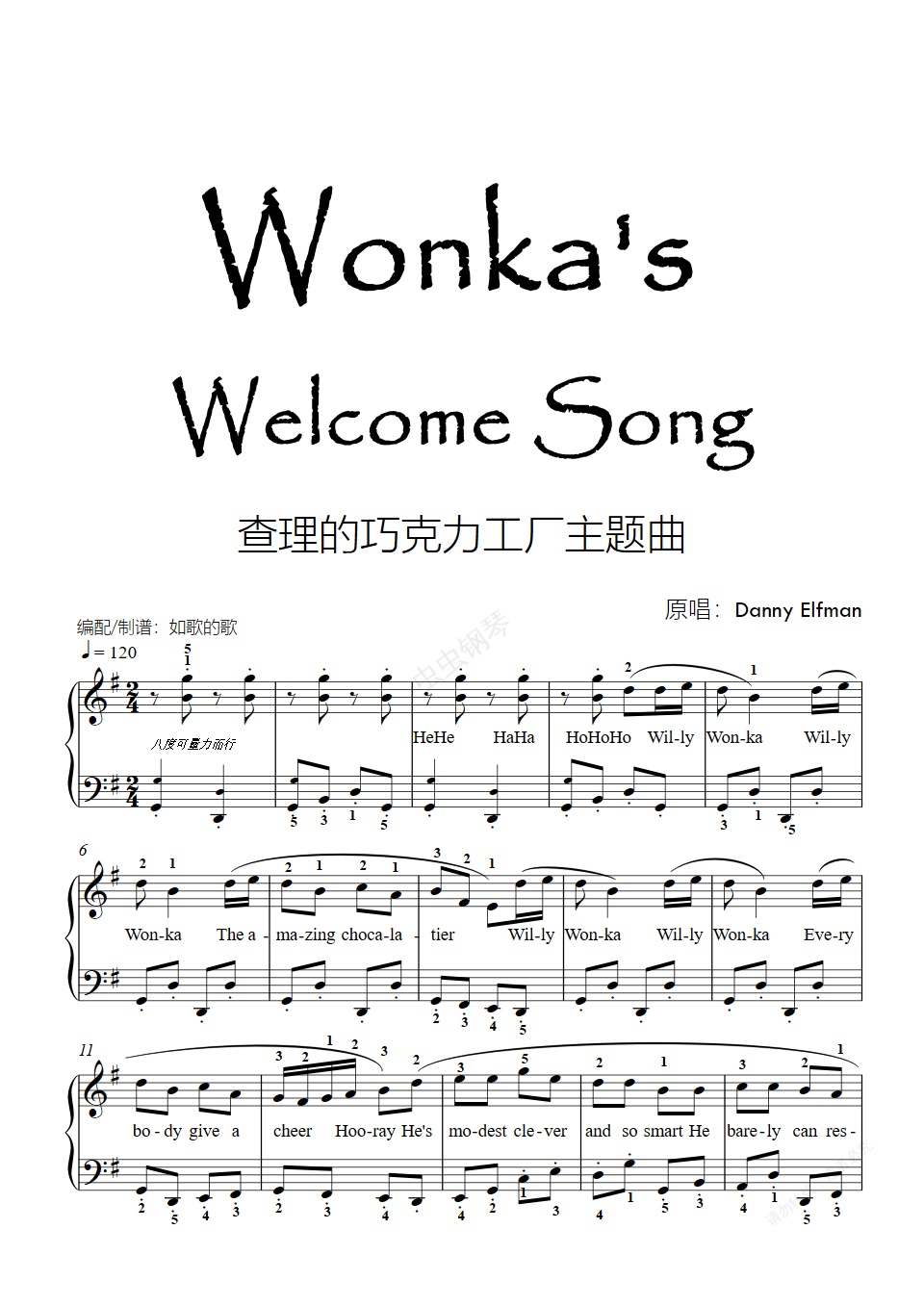 钢琴谱:Wonka's welcome song查理的巧克力工厂主题曲(简易)