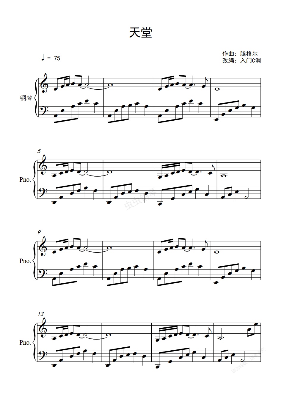 钢琴谱:腾格尔《天堂》入门C调简单版