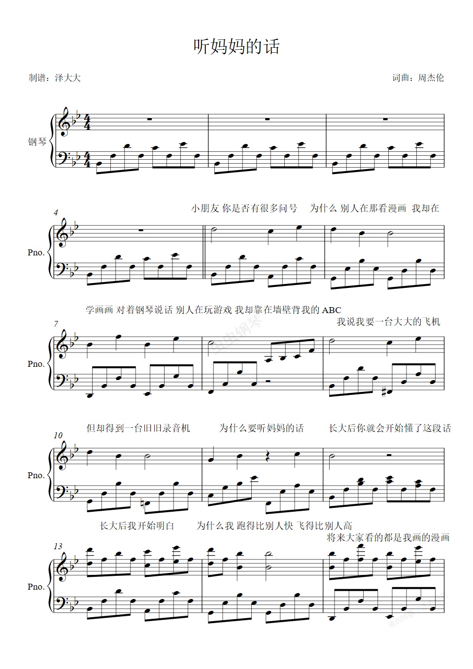 钢琴谱:听妈妈的话【原版弹唱附词】泽大大 周杰伦