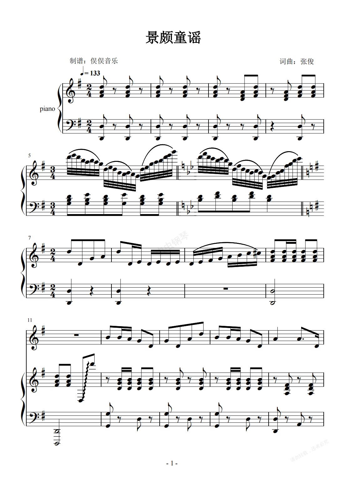 钢琴谱:景颇童谣(三声部合唱伴奏谱)