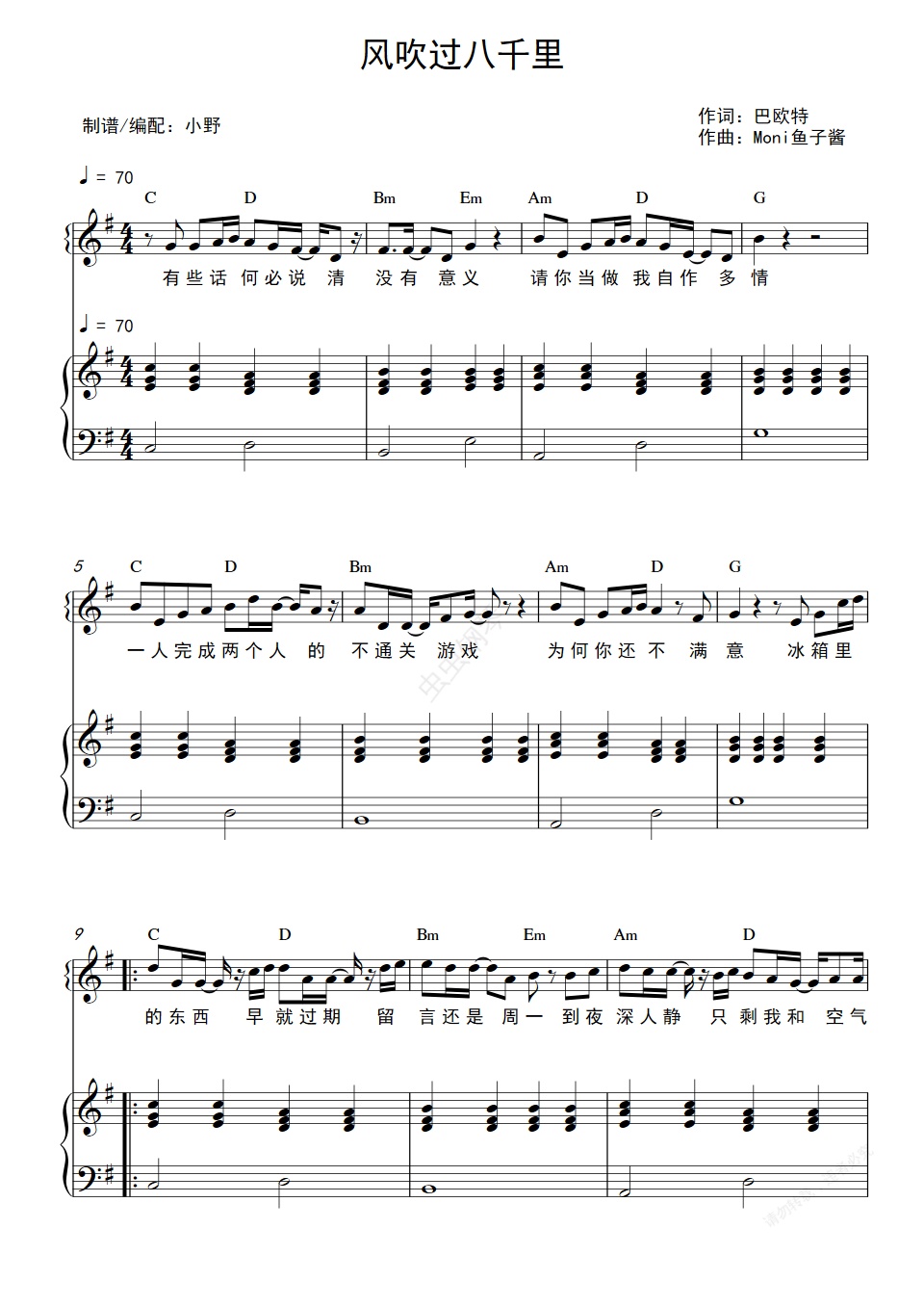 钢琴谱:风吹过八千里(和弦弹唱版)