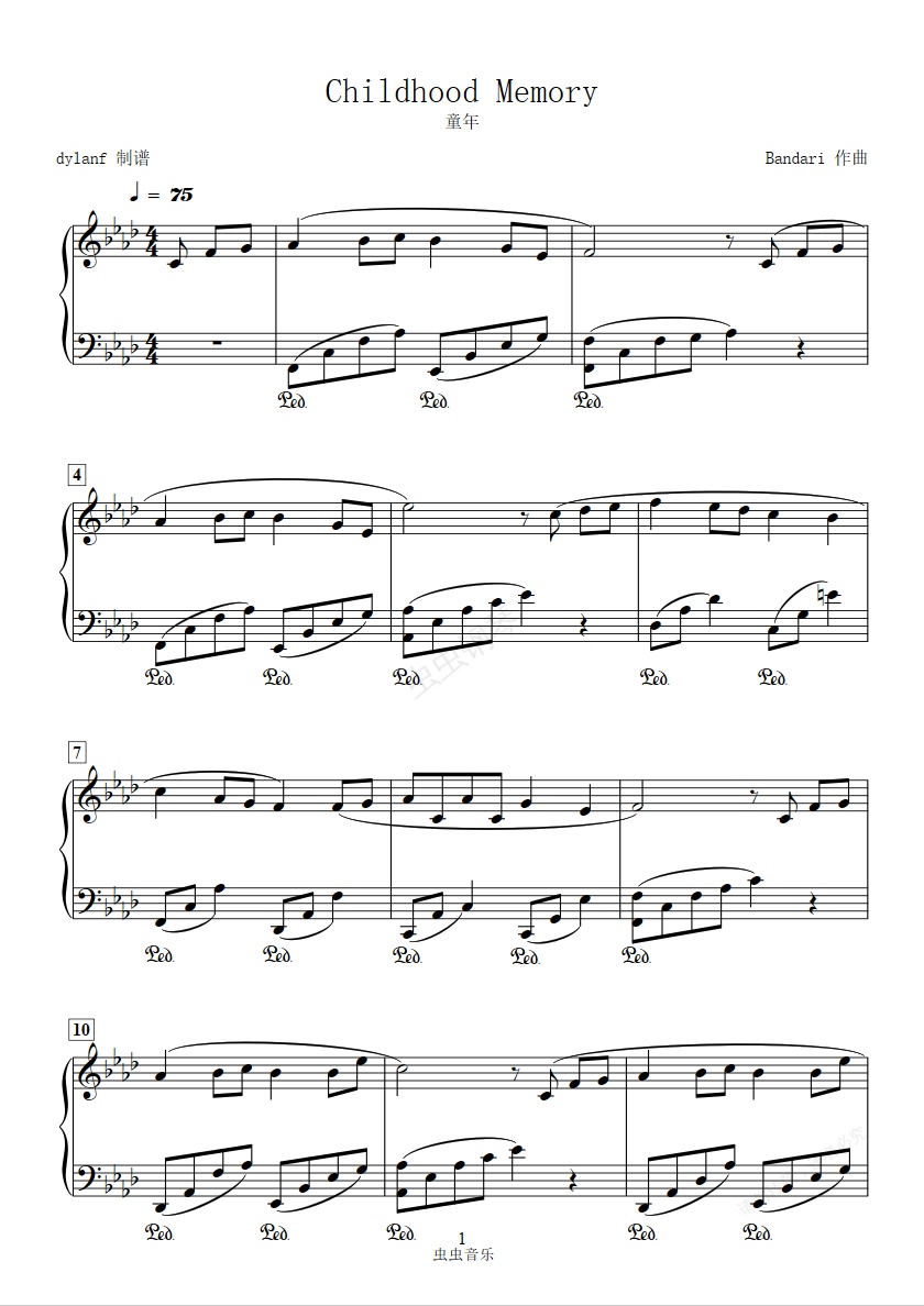 钢琴谱:童年(经典钢琴版)班得瑞Bandari Childhood Memory 童年的回忆