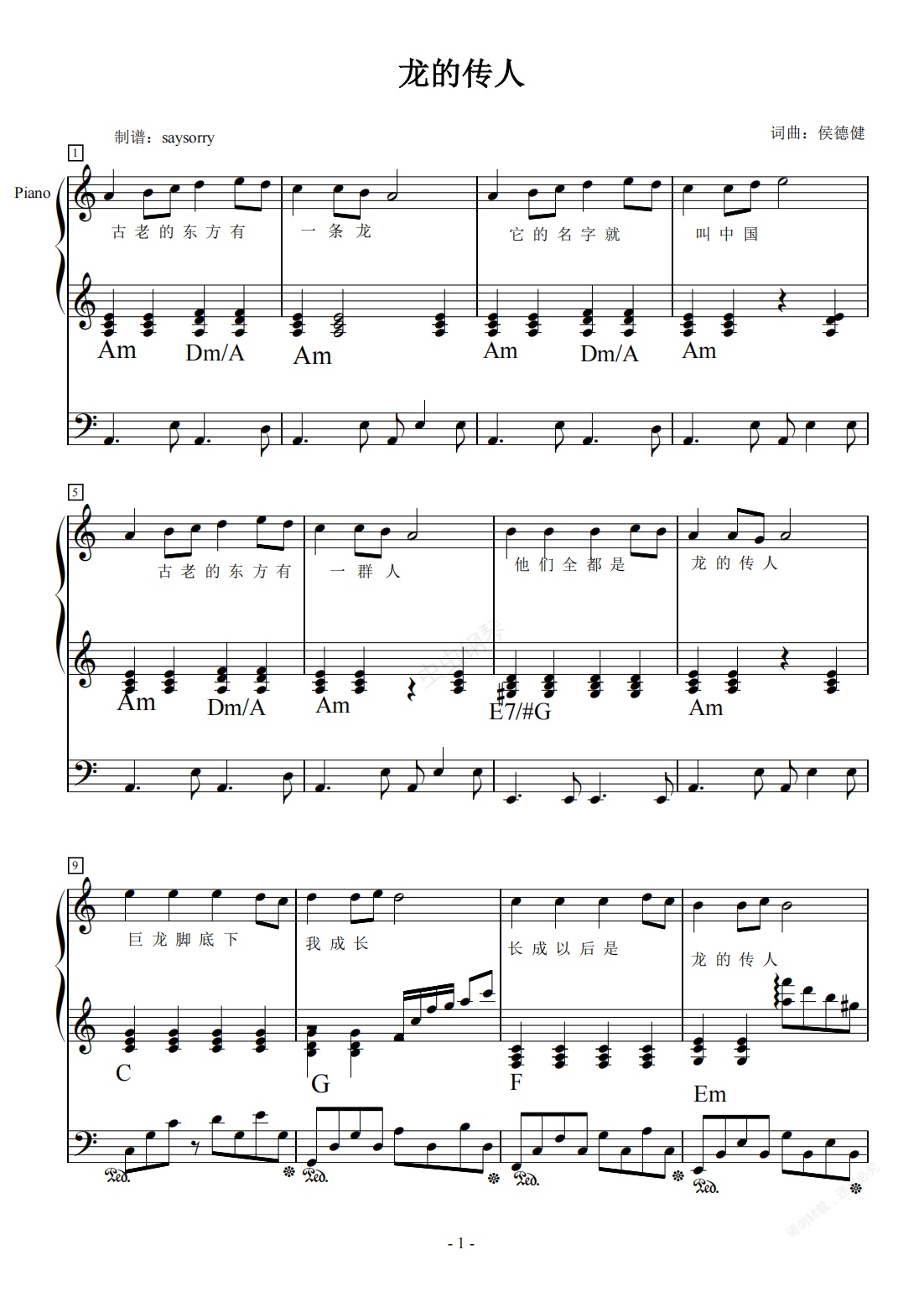 钢琴谱:《龙的传人》弹唱谱华丽版