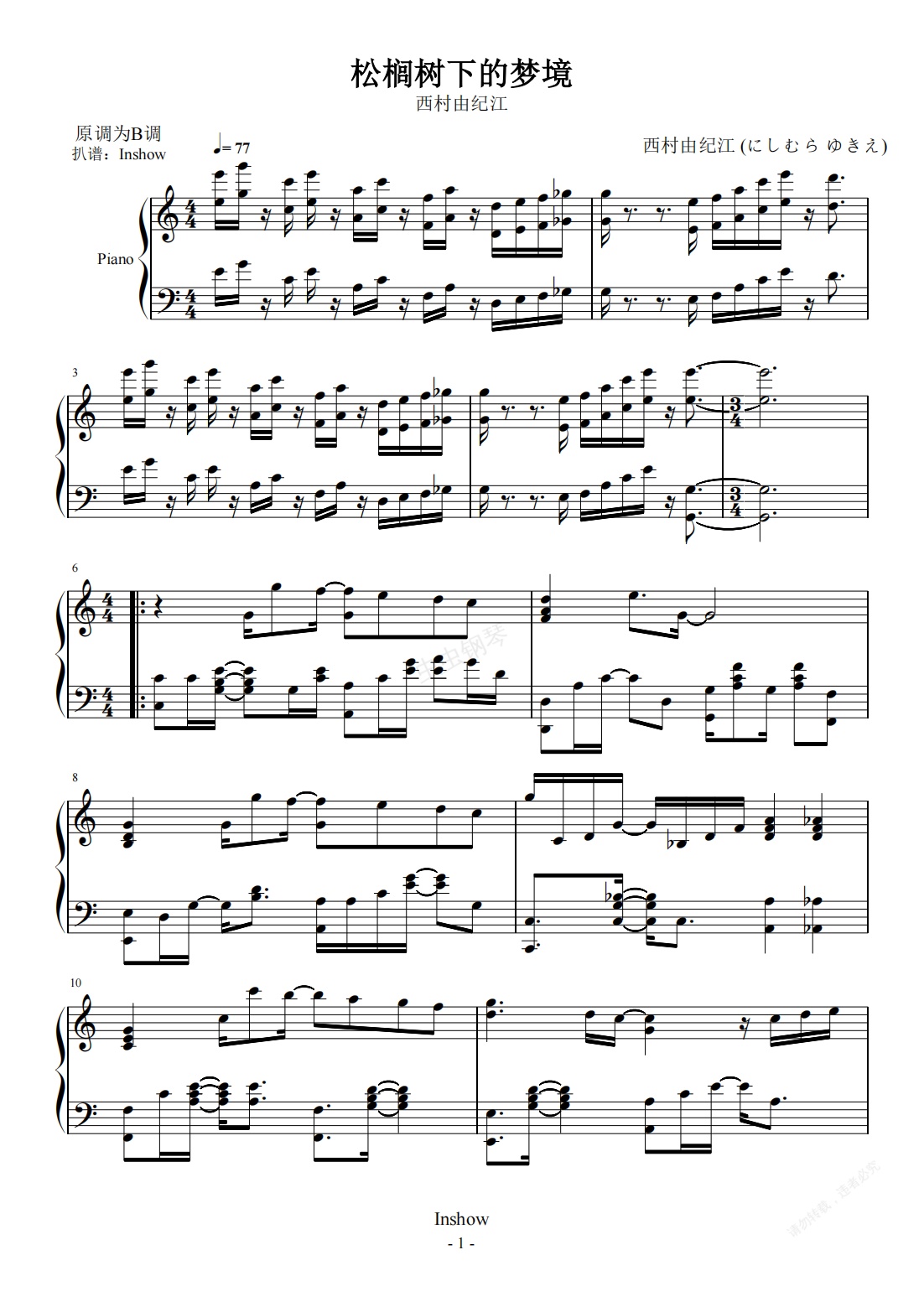 钢琴谱:松榈树下的梦境【C调完整版】- 西村由纪江 -