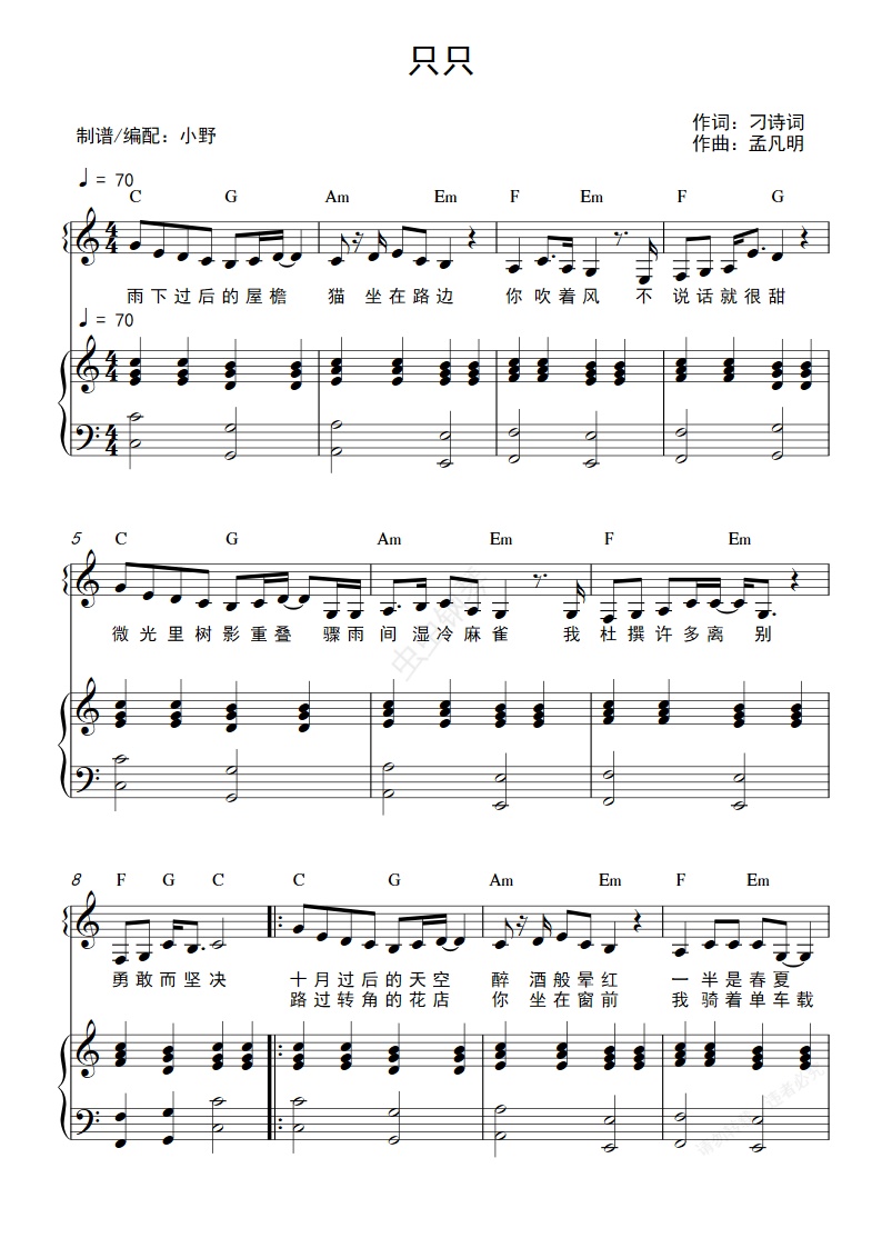 钢琴谱:只只(和弦弹唱版)