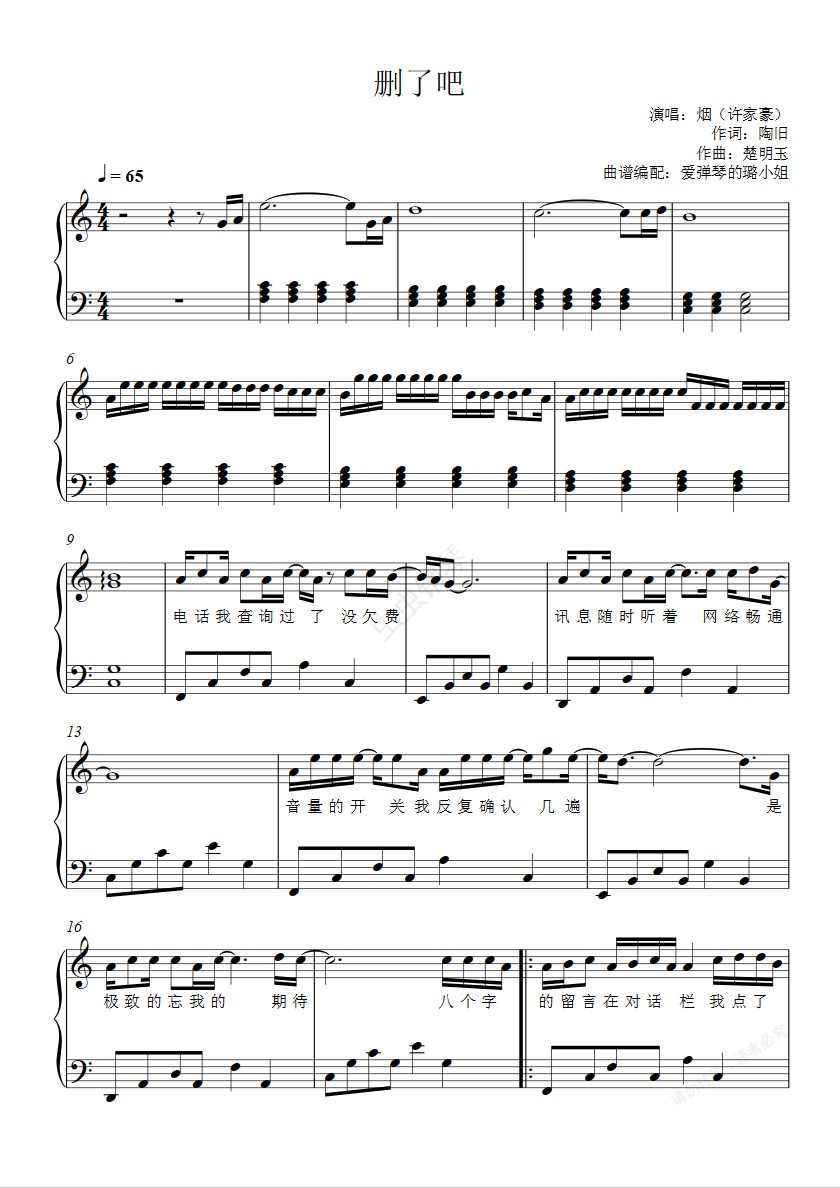 钢琴谱:删了吧(烟. 许佳豪)C调简单版带歌词