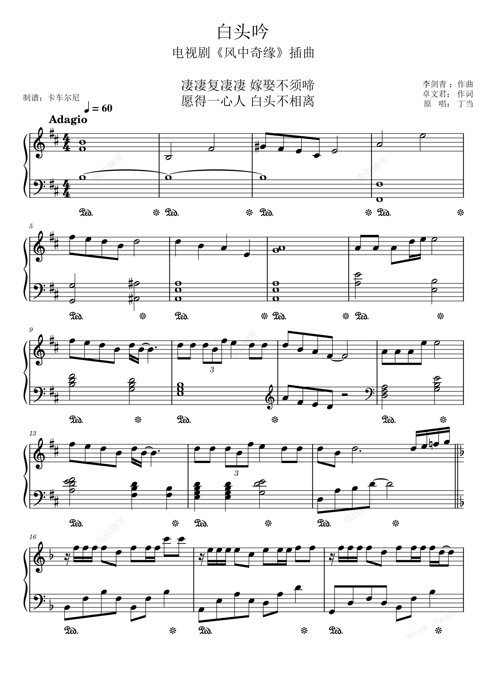 钢琴谱:《白头吟》少升降号版 电视剧《风中奇缘》插曲