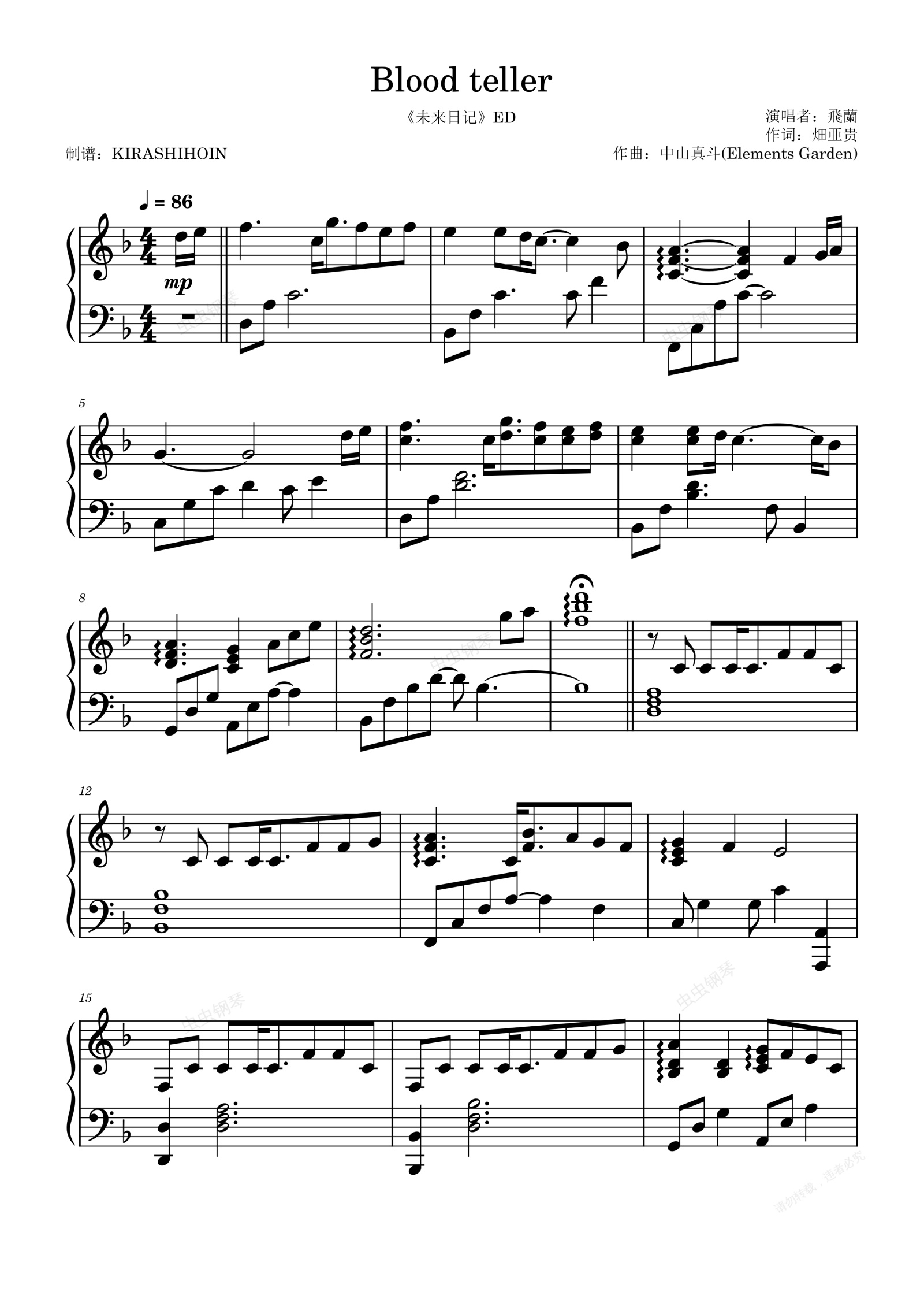 钢琴谱:Blood teller(《未来日记》ED/片尾曲)- 飛蘭