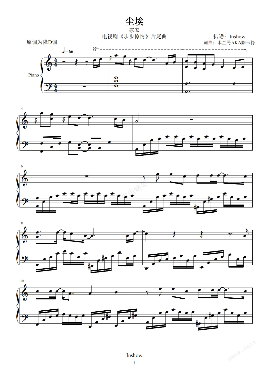 钢琴谱:尘埃【C调独奏】- 家家 -(《步步惊情》的片尾曲)