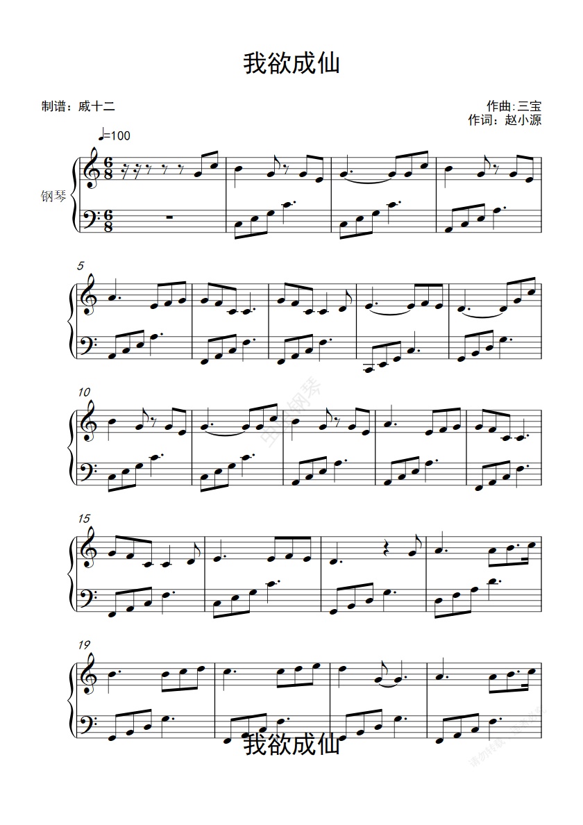 钢琴谱:我欲成仙<西游记后传>片头曲-C调简单版
