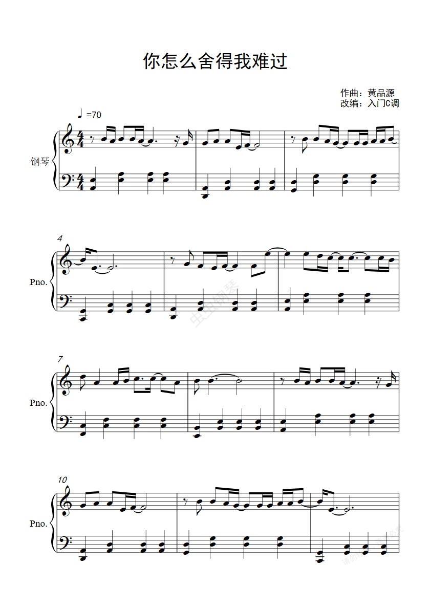 钢琴谱:黄品源《你怎么舍得我难过》(《蓝宇》片尾曲)入门C调简单版