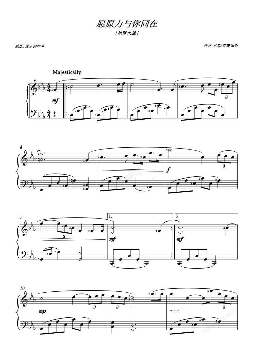 钢琴谱:「星球大战」- 带指法简易版 - 原力主题 - 愿原力与你同在