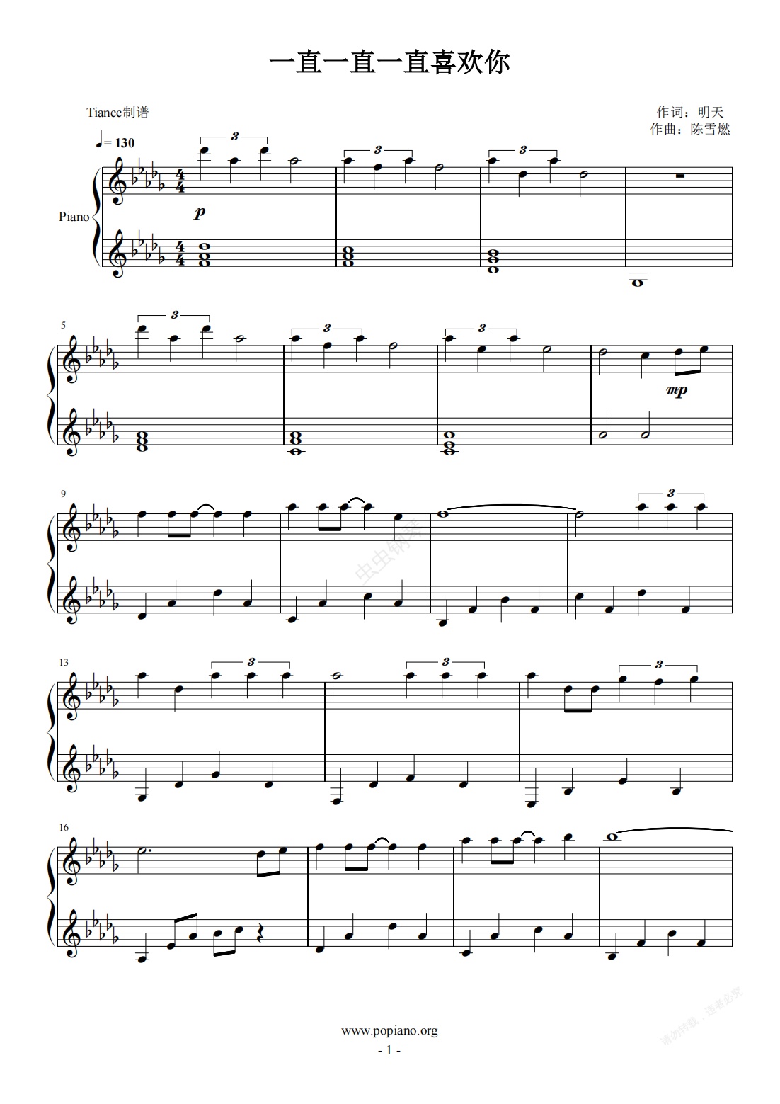 钢琴谱:《一直一直一直喜欢你》李鑫一,暗格里的秘密,原调599难度