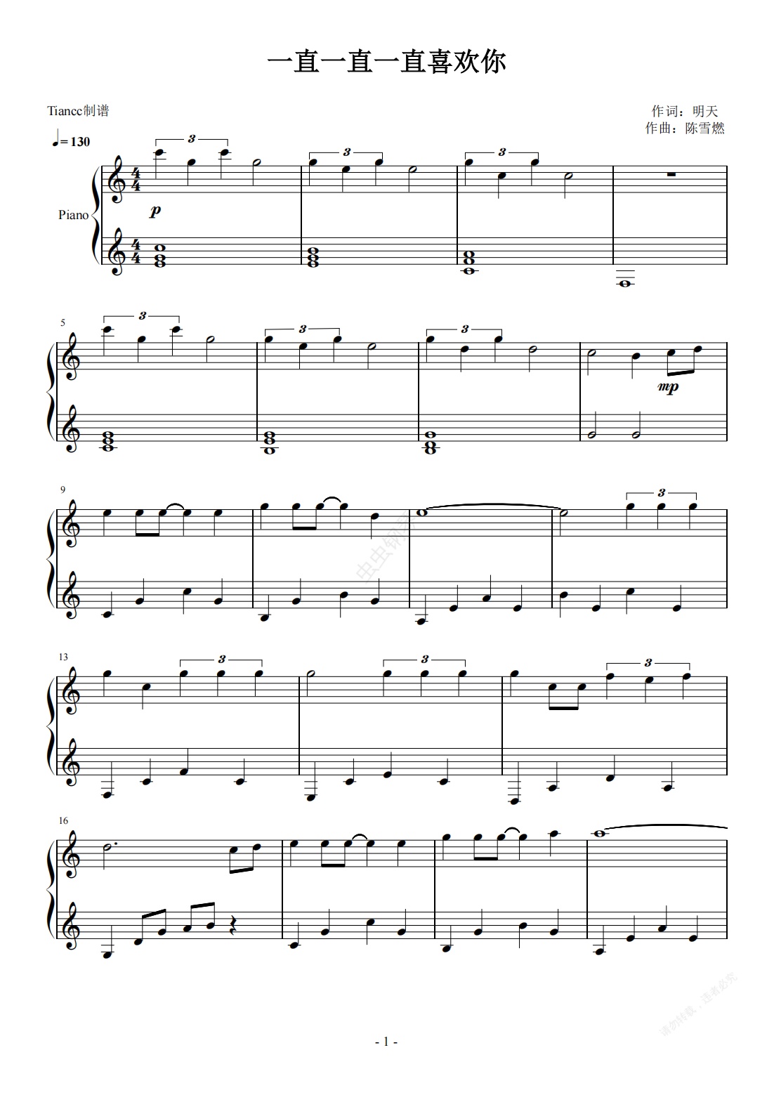 钢琴谱:《一直一直一直喜欢你》李鑫一,C调599难度
