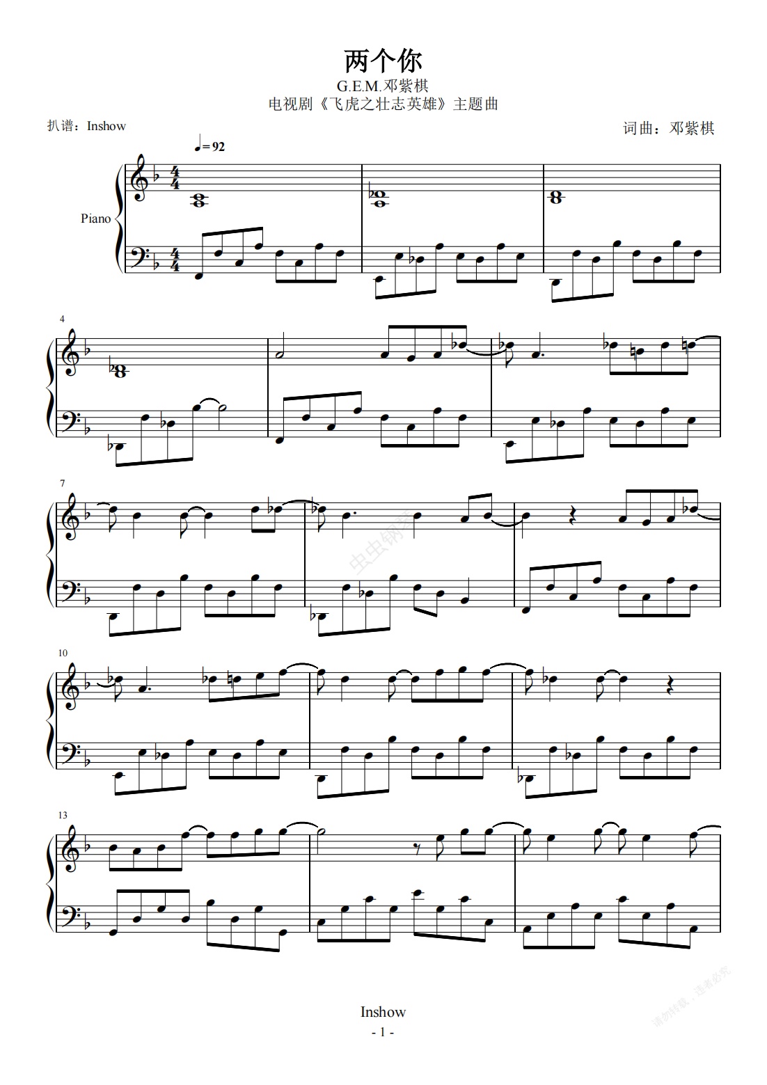 钢琴谱:两个你【独奏】- G.E.M.邓紫棋 -