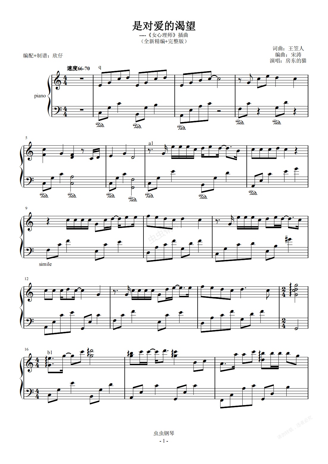 钢琴谱:房东的猫-C《是对爱的渴望》(《女心理师》插曲、全新精编+完整版)