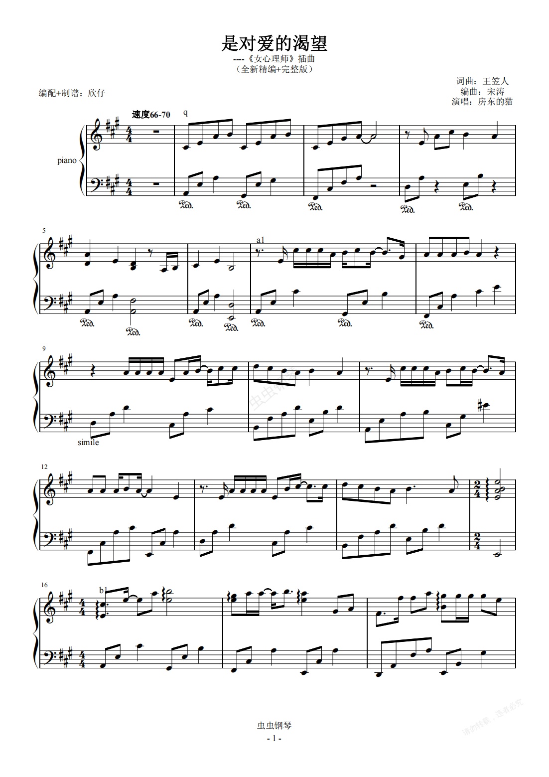 钢琴谱:房东的猫-A《是对爱的渴望》(《女心理师》、全新精编+完整版)