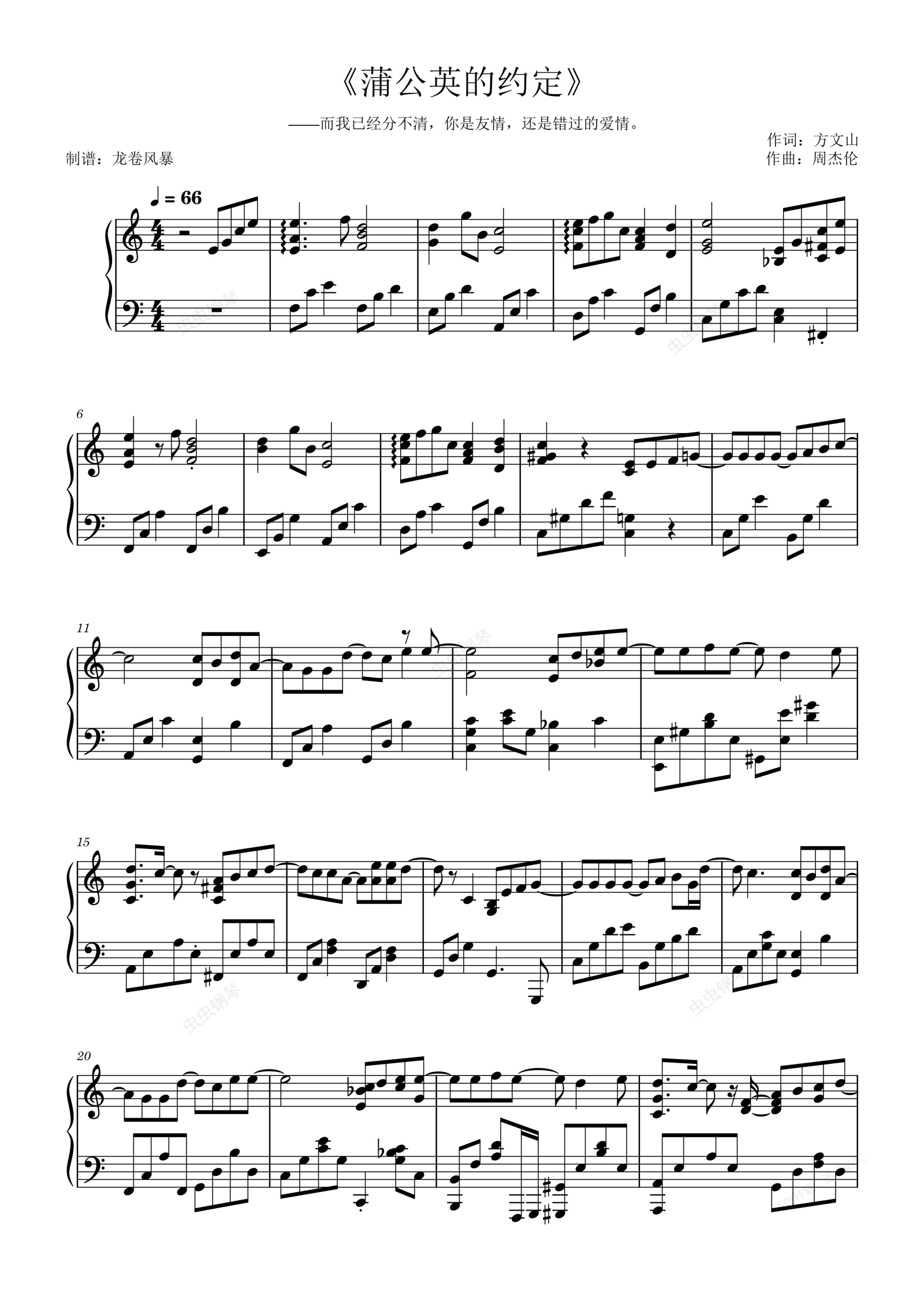 钢琴谱:《蒲公英的约定》周杰伦(C调高还原唯美版)