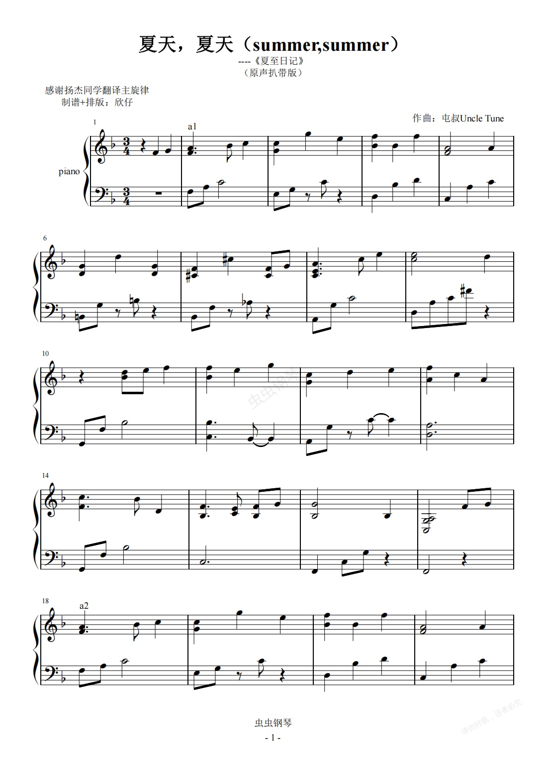 钢琴谱:屯叔Uncle Tune-F《夏天,夏天》钢琴曲(原声扒带版)