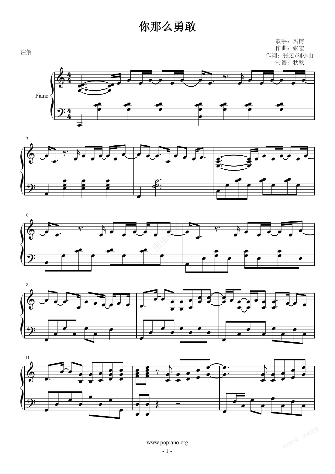 钢琴谱:你那么勇敢-冯博(C调)