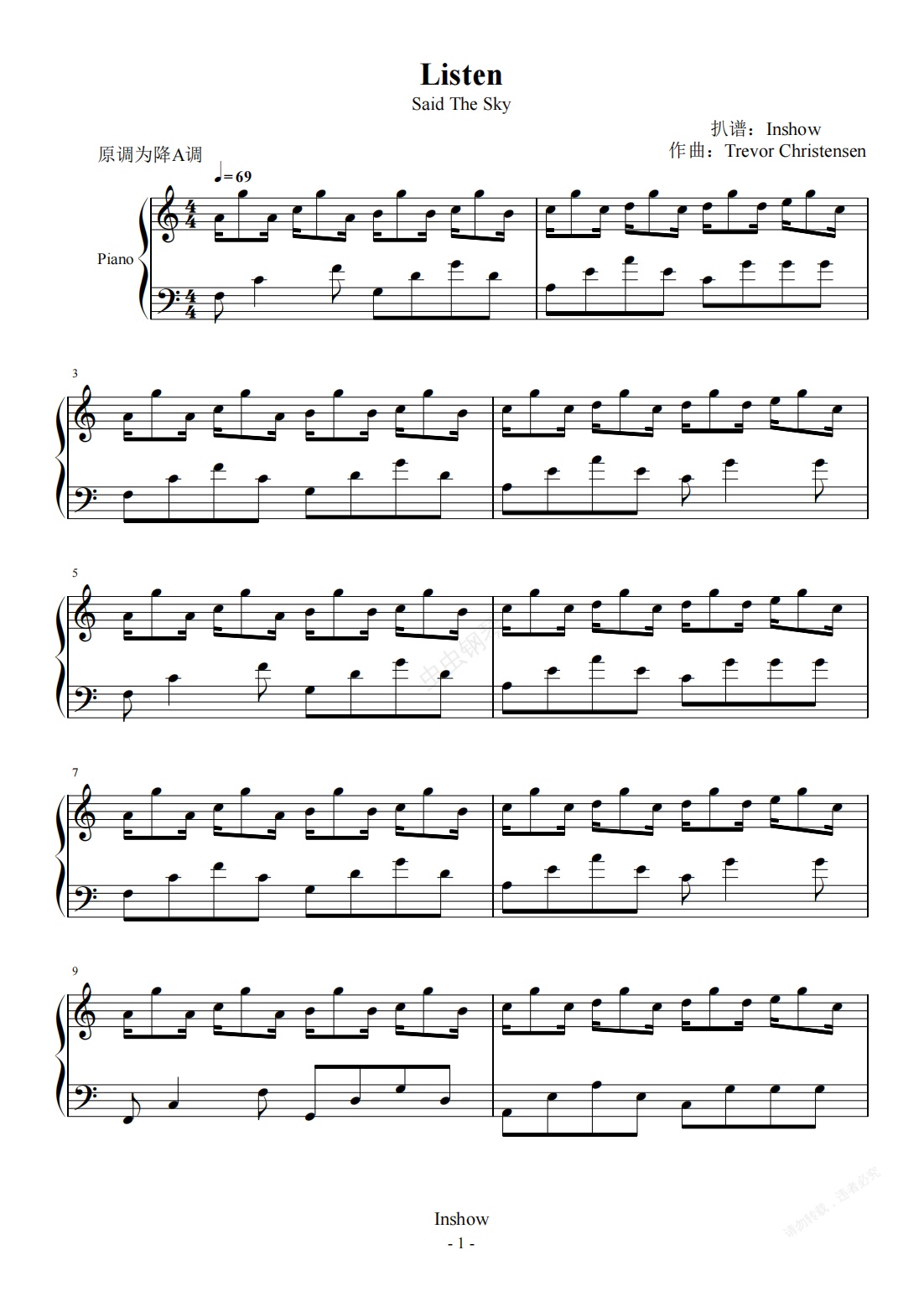 钢琴谱:Listen【C调独奏】- Said The Sky -