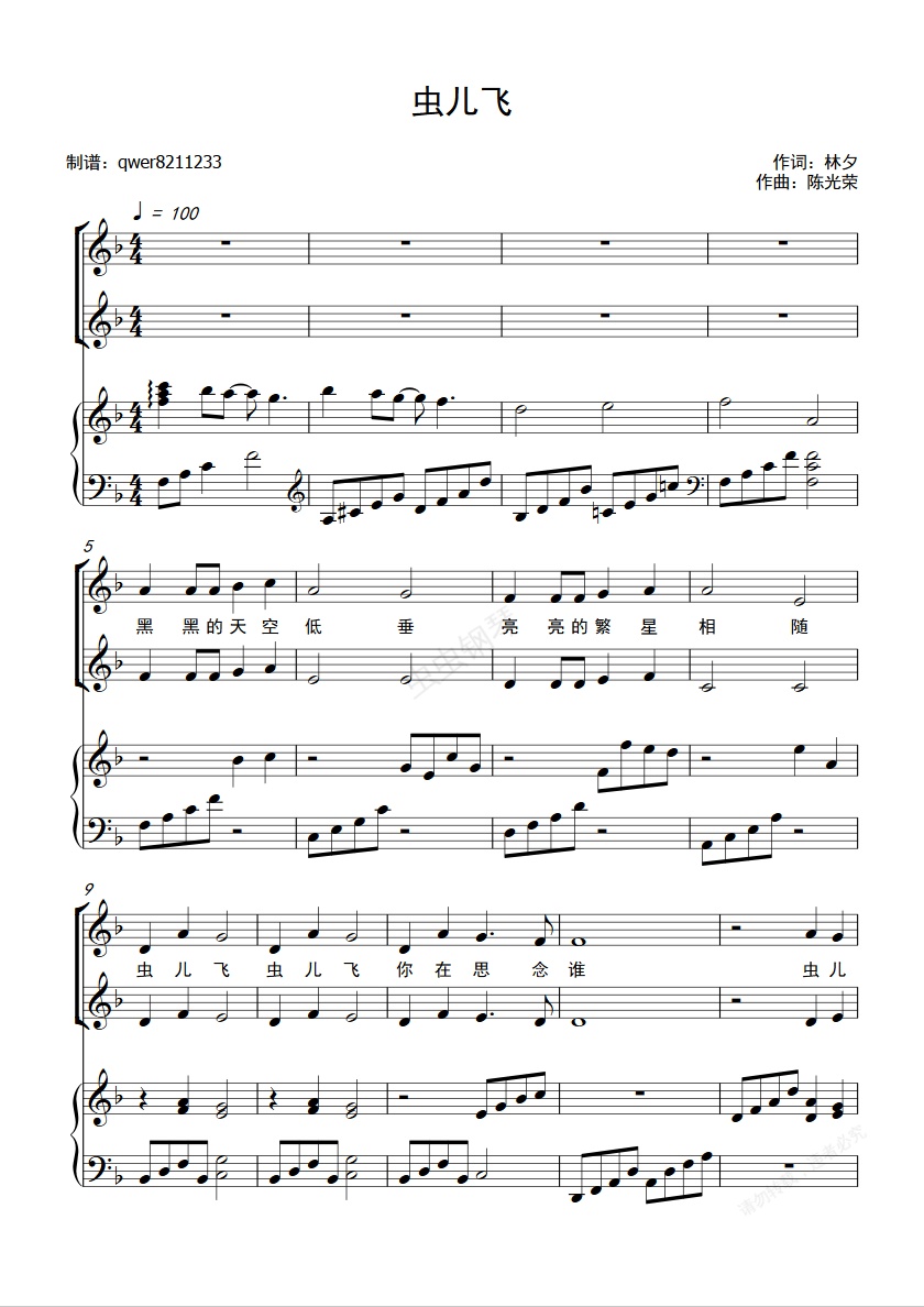 钢琴谱:童声合唱《虫儿飞》 和平区青少年宫小白鸽童声合唱团