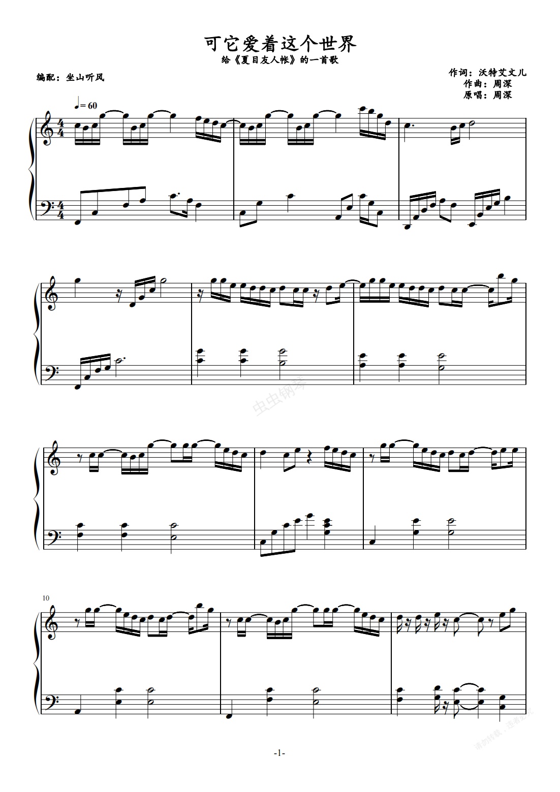 钢琴谱:可它爱着这个世界——给《夏目友人帐》的一首歌