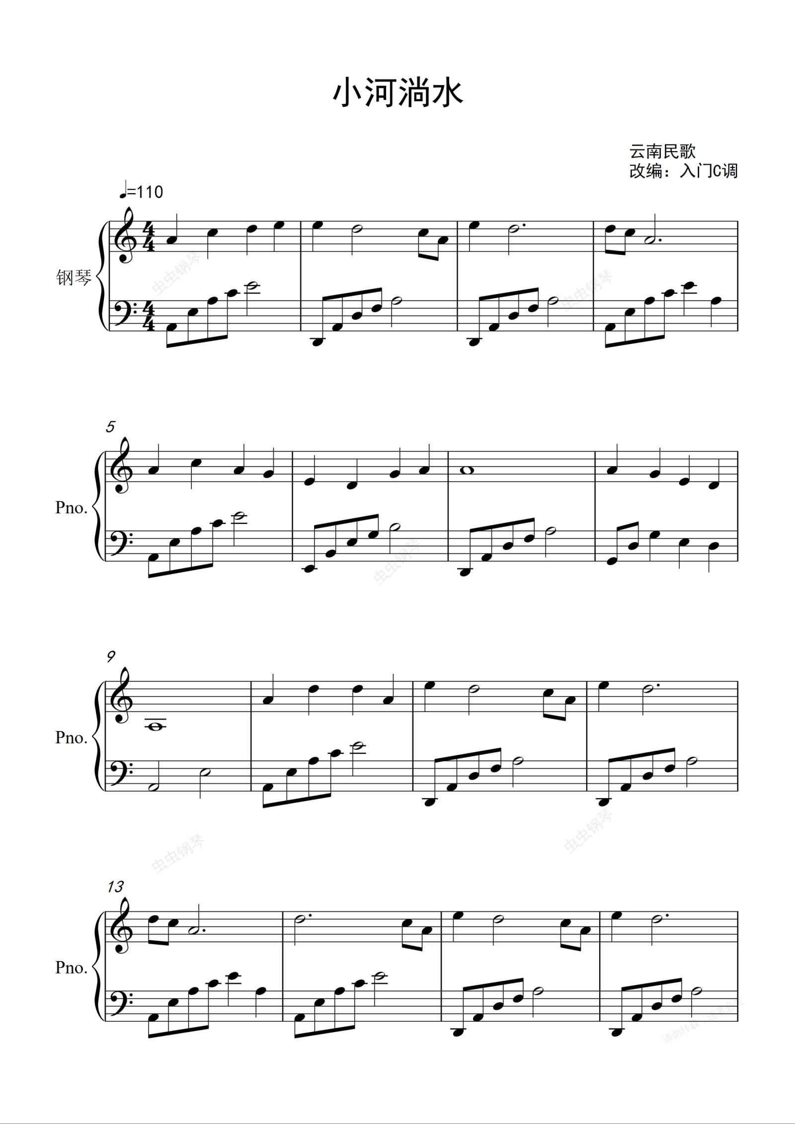 钢琴谱:《小河淌水》云南民歌入门C调简单版
