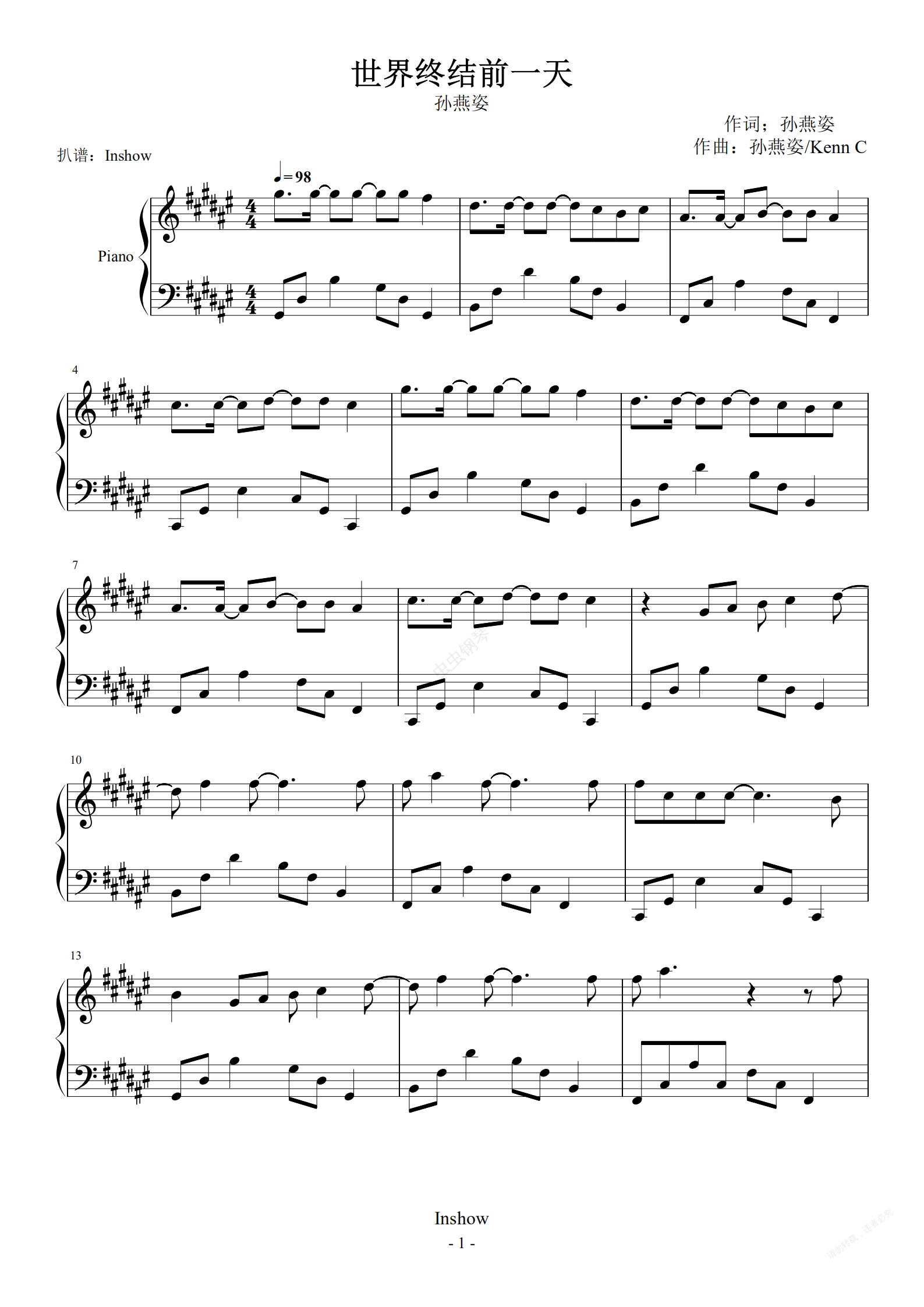 钢琴谱:世界终结前一天【原调独奏】- 孙燕姿 -